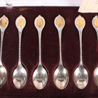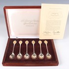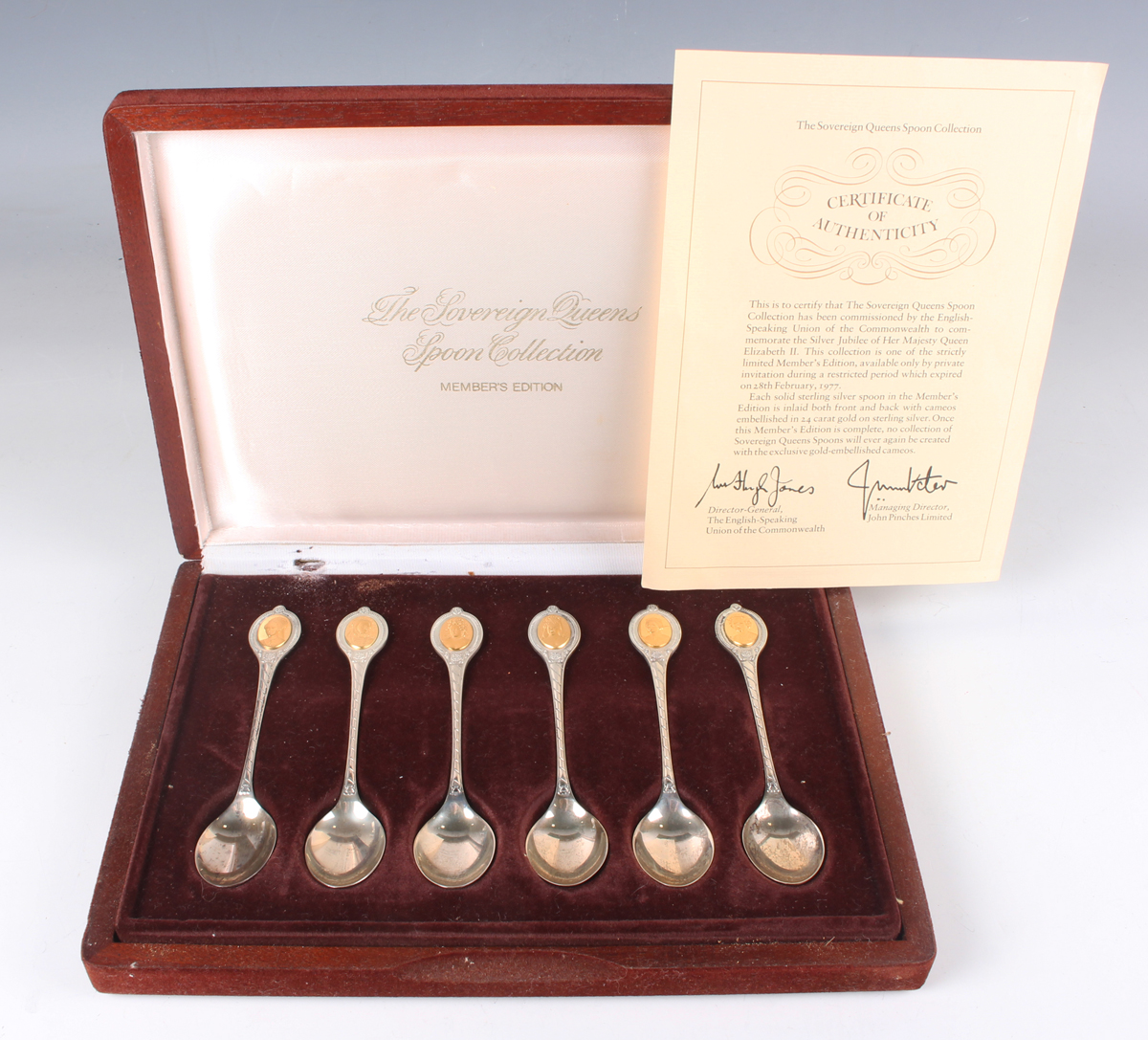 A set of six Elizabeth II silver 'The Sovereign Queens Spoon Collection' spoons, each terminal gilt inlaid with a different bust portrait of a queen, Sheffield 1977 by John Pinches Ltd, total weight 150.9g, cased with a certificate.