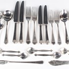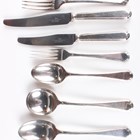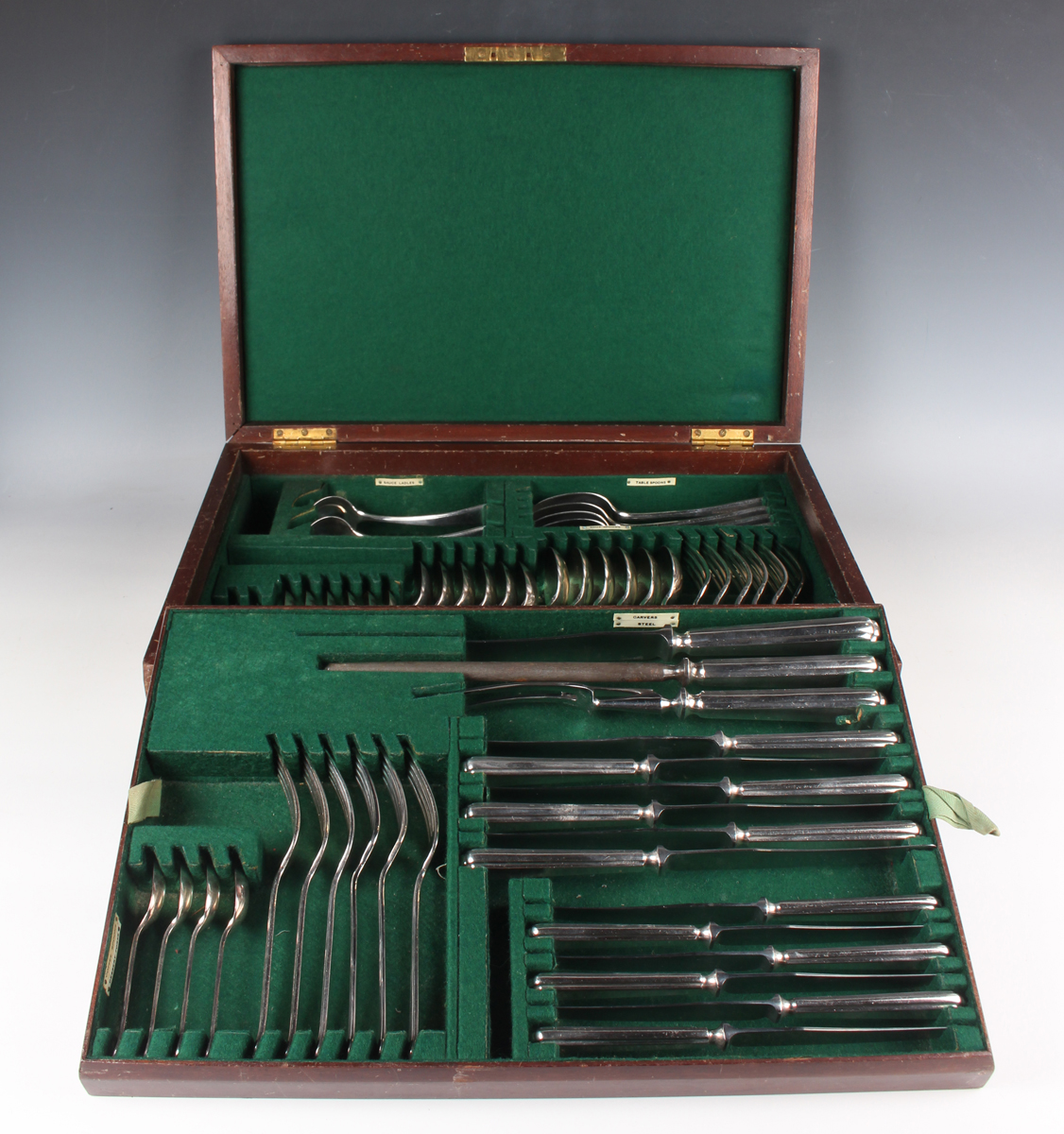 A Walker & Hall part canteen of plated St James pattern cutlery, comprising four tablespoons, eight table knives and forks, eight dessert knives, forks and spoons, eight soup spoons, eight teaspoons, eight coffee spoons, two sauce ladles and a three-piece carving set, the majority within an oak canteen box, together with a small group of other plated cutlery.