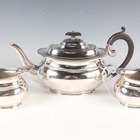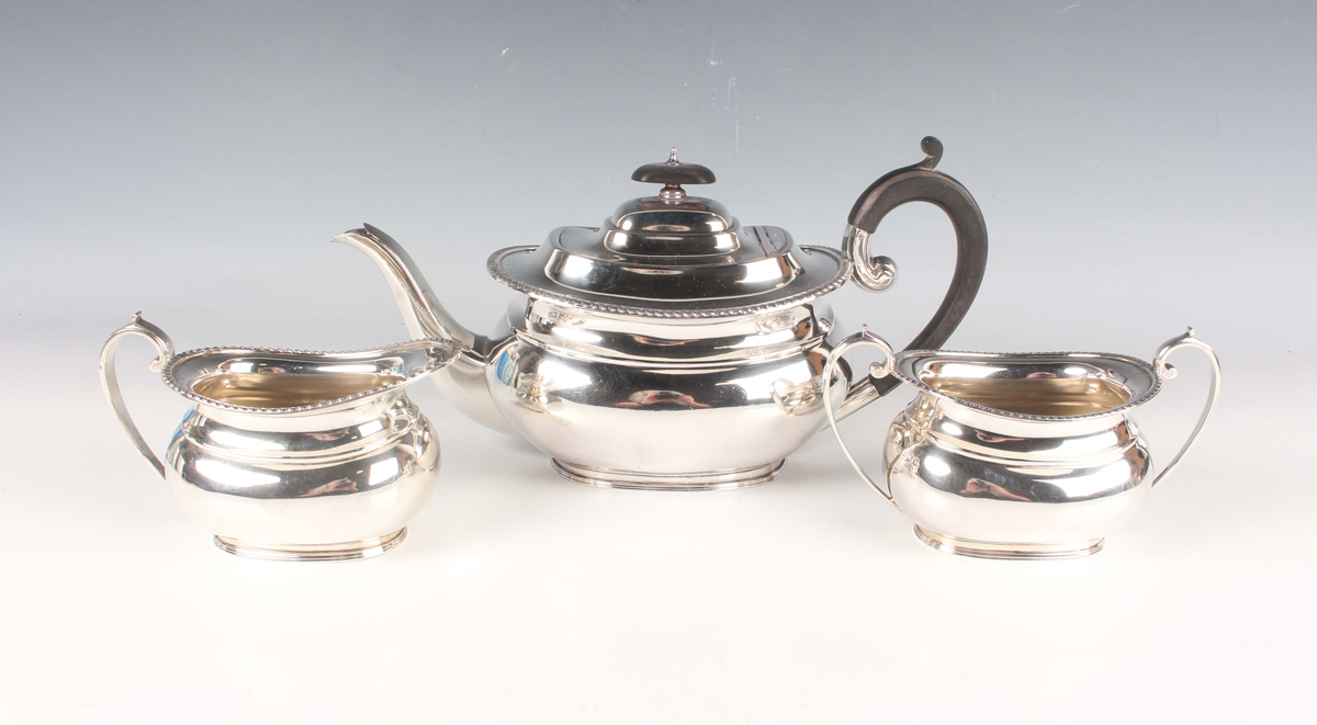 A George V silver three-piece tea set of cushion form with gadrooned rims, comprising teapot, two-handled sugar bowl and milk jug, Sheffield 1926 by Harrison Brothers & Howson, total weight 1042.3g, length of teapot 29cm.