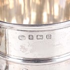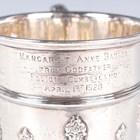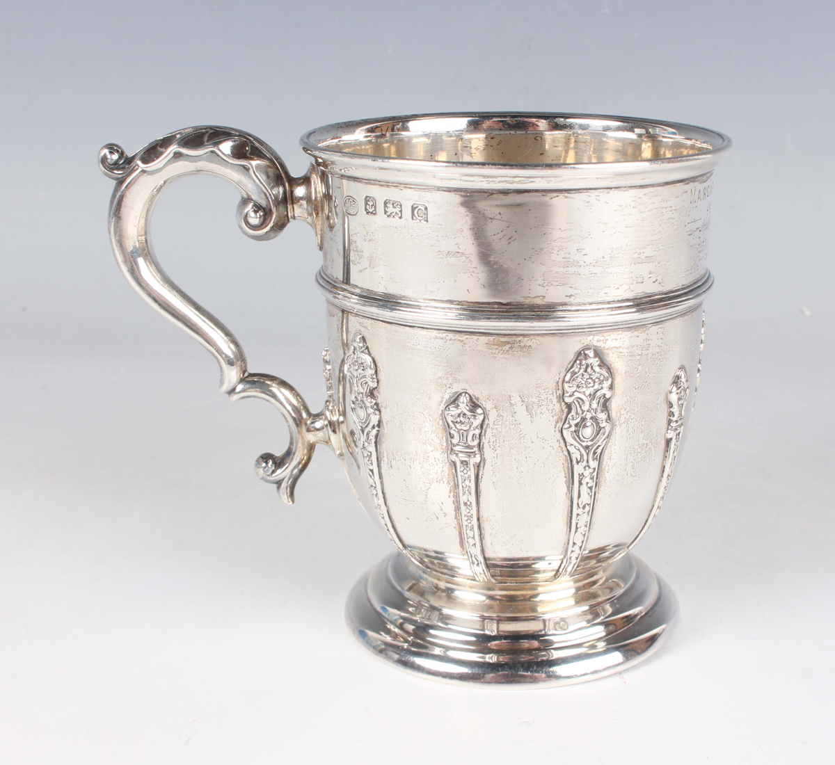 A George V silver christening tankard, the 'U' shaped girdled body with strapwork decoration and inscription engraved, flanked by a foliate capped scroll handle, on a stepped circular foot, Birmingham 1927 by Alexander Clark & Co Ltd, weight 175.3g, height 10cm.