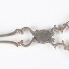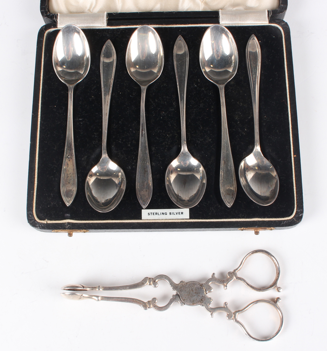 A pair of George VI silver sugar nips with scroll handles, Birmingham 1937 by A. Marston & Co, length 12cm, and a set of six silver coffee spoons, Birmingham 1937 by Arthur Price & Co Ltd, cased, total weight 98.9g.