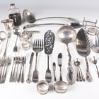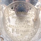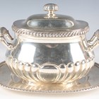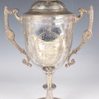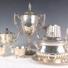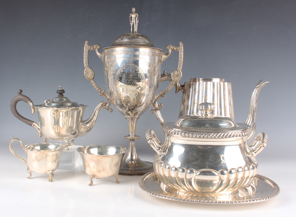 A group of plated items, including a Victorian two-handled trophy cup and cover with figural finial, the front with inscription 'West End Regatta June 18th 1881... ', height 34.5cm, a Gorham & Co two-handled half-reeded tureen, cover and stand with gadrooned decoration, length of stand 23.3cm, a set of three Gorham & Co servers and a pair of Fiddle pattern fish servers, together with two silver napkin rings, total weight 27.2g.
