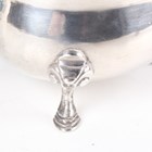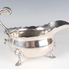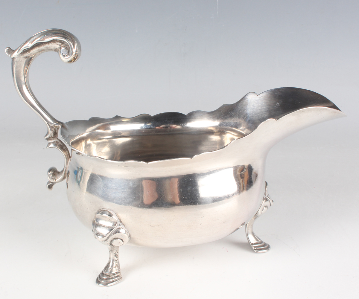A George II silver sauceboat with foliate capped flying scroll handle, raised on cast scroll shouldered legs terminating in hoof feet, London 1741 by Joseph Sanders, weight 313.9g, height 12.5cm, length 18cm.