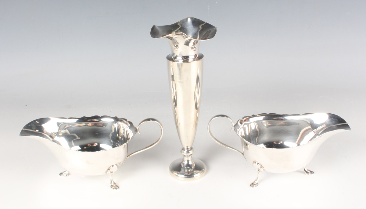 A pair of Edward VIII silver sauceboats, each with a scroll handle, raised on trefoil shouldered scroll legs terminating in hoof feet, Sheffield 1936 by Mappin & Webb Ltd, total weight 188.8g, and a silver specimen vase with lobed rim above a tapering body on a weighted circular foot, Birmingham 1913, height 17.5cm.