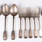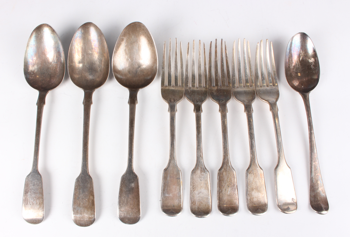 A set of three early Victorian silver Fiddle pattern tablespoons, London 1841 by Charles Lias, a set of five silver Fiddle pattern dessert forks, London 1854 by Samuel Hayne & Dudley Cater, and a silver Hanoverian pattern tablespoon, London 1776 by Thomas Chawner, total weight 672.5g.