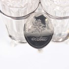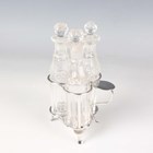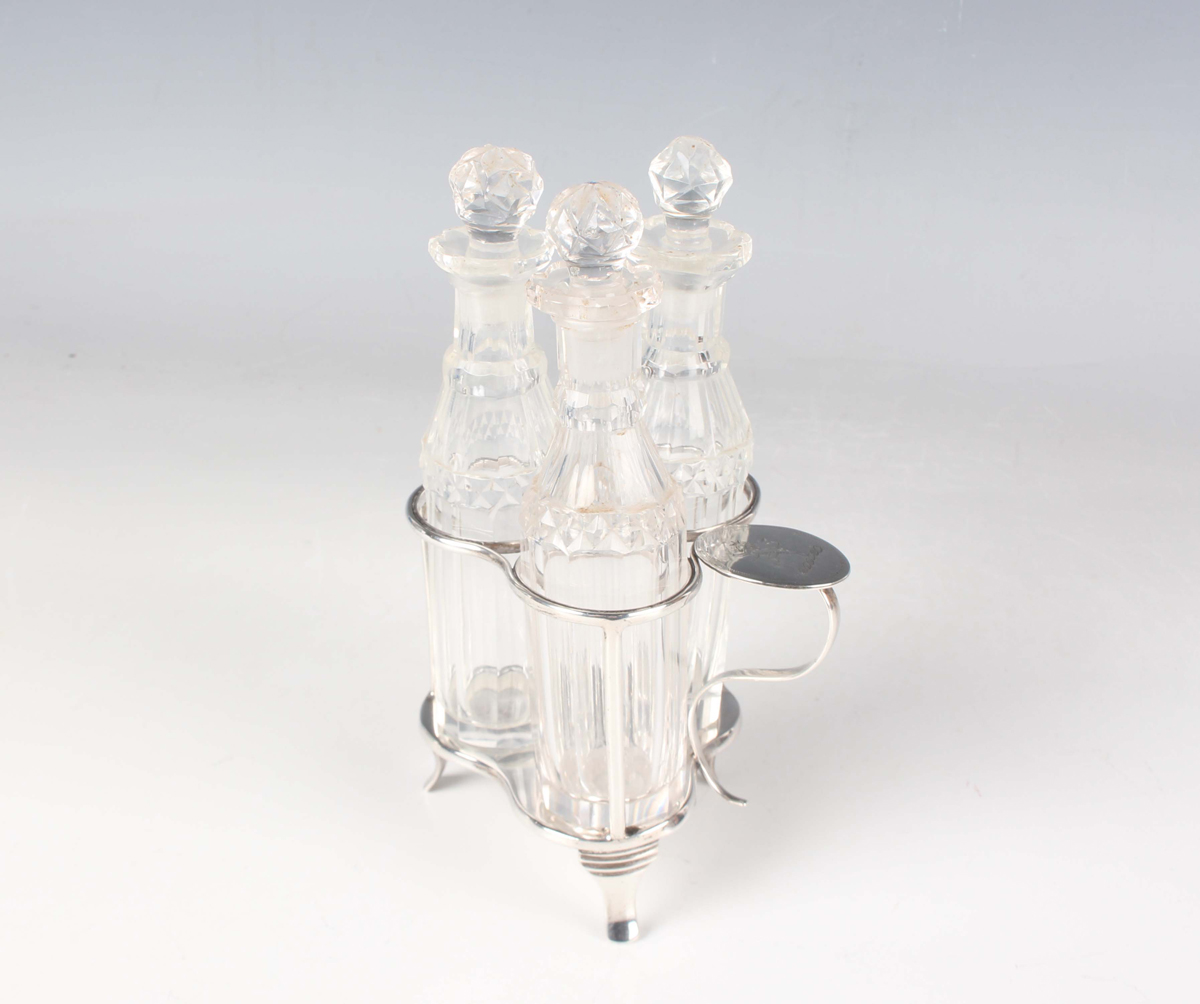 A George III silver three-bottle cruet stand of trefoil form with loop handle, surmounted by an oval thumbpiece, crest engraved, raised on reeded tapering legs, fitted with three cut glass bottles and stoppers, London 1800 by Josiah Snatt, weight of stand 68.3g, height 7.8cm.