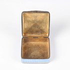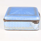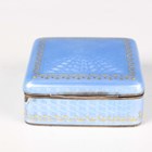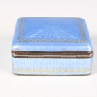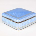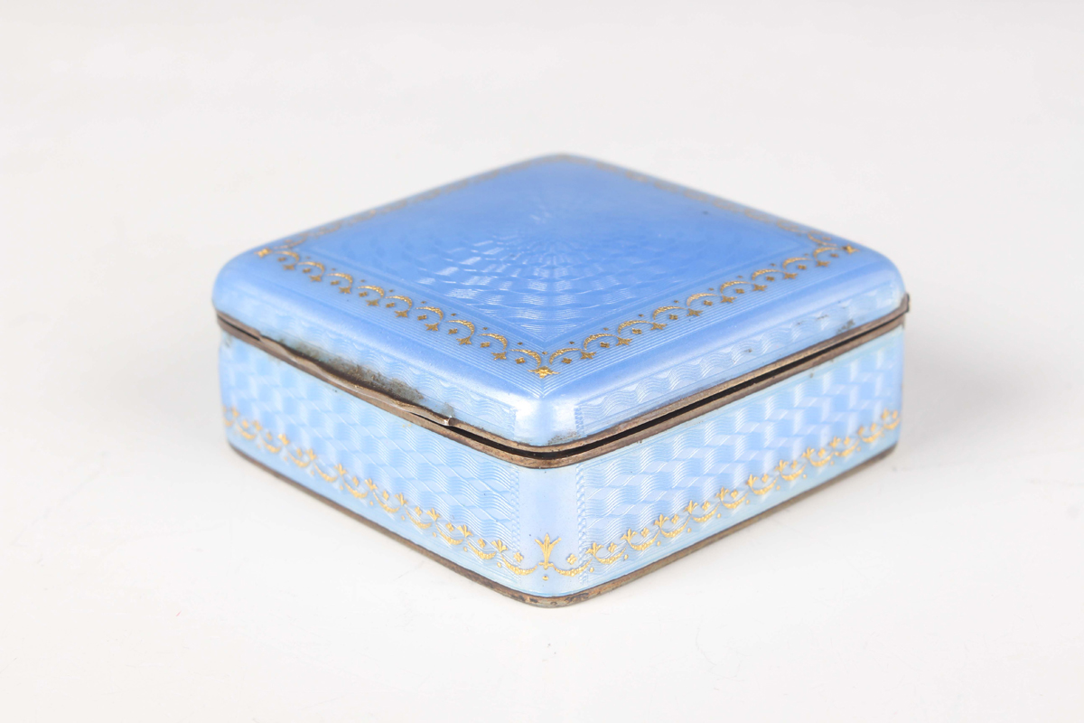 A Continental silver gilt and pale blue enamelled square box and cover, the hinged lid and sides with guilloché enamelled decoration and gilt detail, weight 87.2g, width 5.1cm (chipped enamel to one corner).
