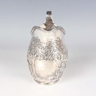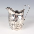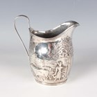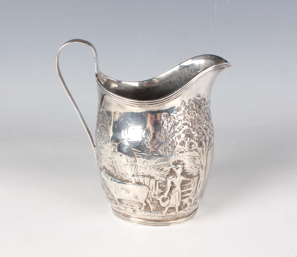 A George III silver helmet shaped cream jug with reeded rim and loop handle, the body embossed with a rural scene, London 1798, weight 120.1g, height 12.2cm.