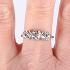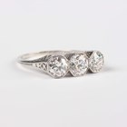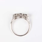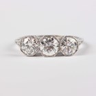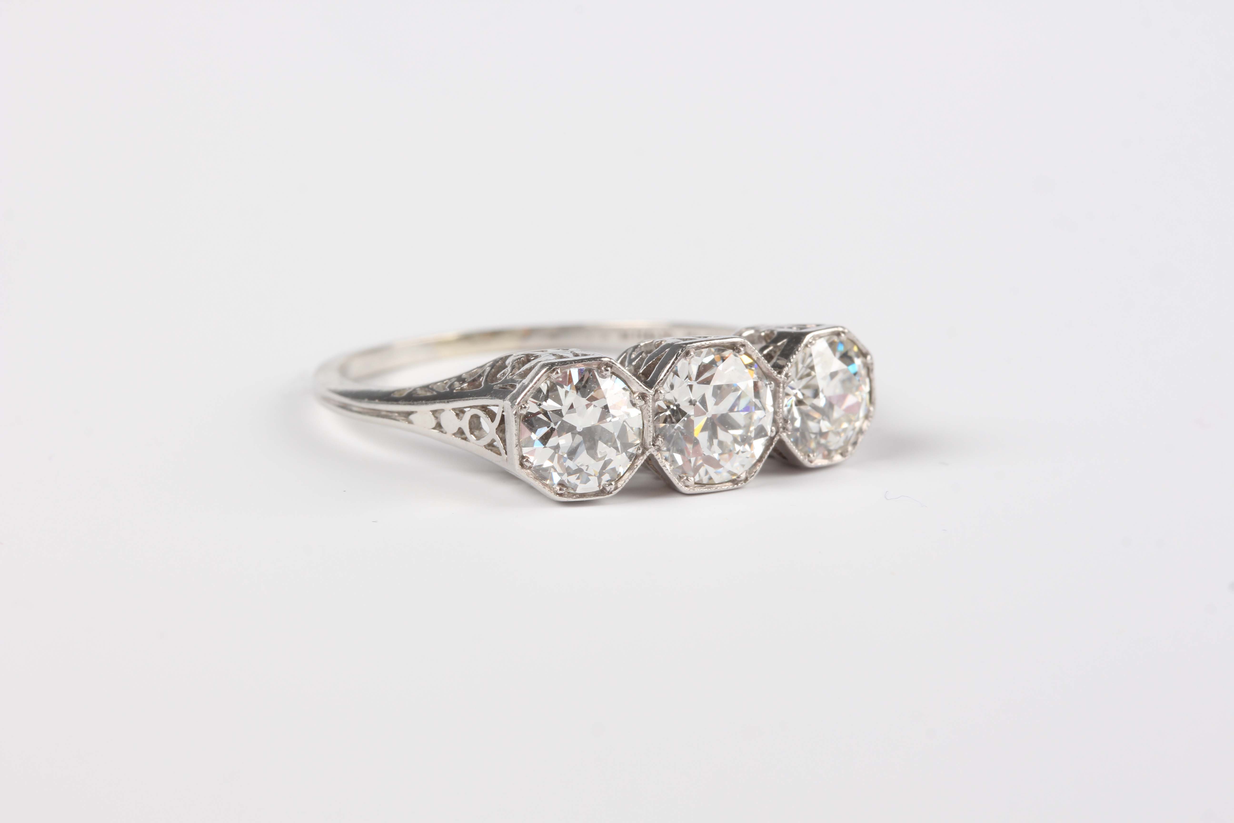 A platinum and diamond three stone ring, mounted with a row of cushion shaped diamonds within octagonal settings, the mount with pierced decoration, detailed ‘Platinum’, weight 3.6g, total diamond weight approx 1.80-2.00ct, ring size approx R, with a case.