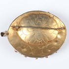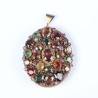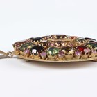 A gilt metal oval pendant brooch, first half 20th century, mounted with a variety of coloured gemstones, including zircon, garnet and ruby, the reverse with engraved decoration, length 7cm.