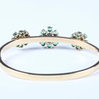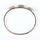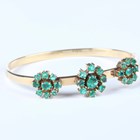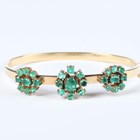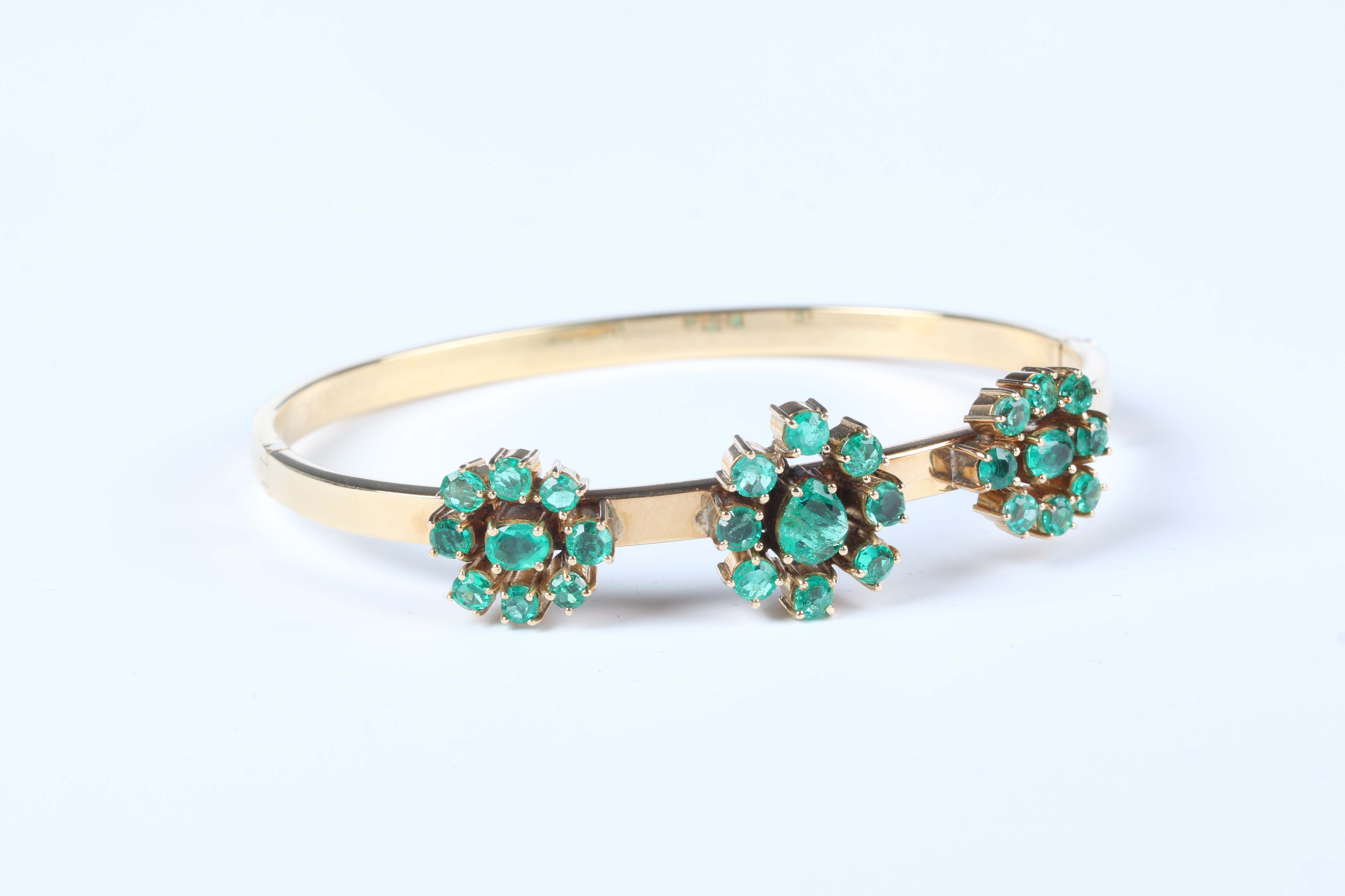 An Italian gold and emerald oval hinged bangle, the front mounted with three nine stone emerald clusters, on a snap clasp, detailed ‘750’, weight 13.7g, total emerald weight approx 3.00-3.50ct, inside width 6cm, with a case.