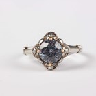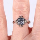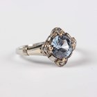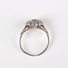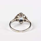 A white gold ring, claw set with a circular cut pale blue paste within a surround set with four rose cut diamonds, detailed ‘750’, weight 3g, ring size approx M1/2.