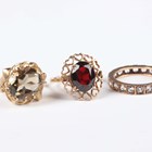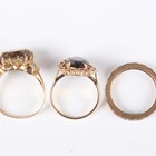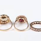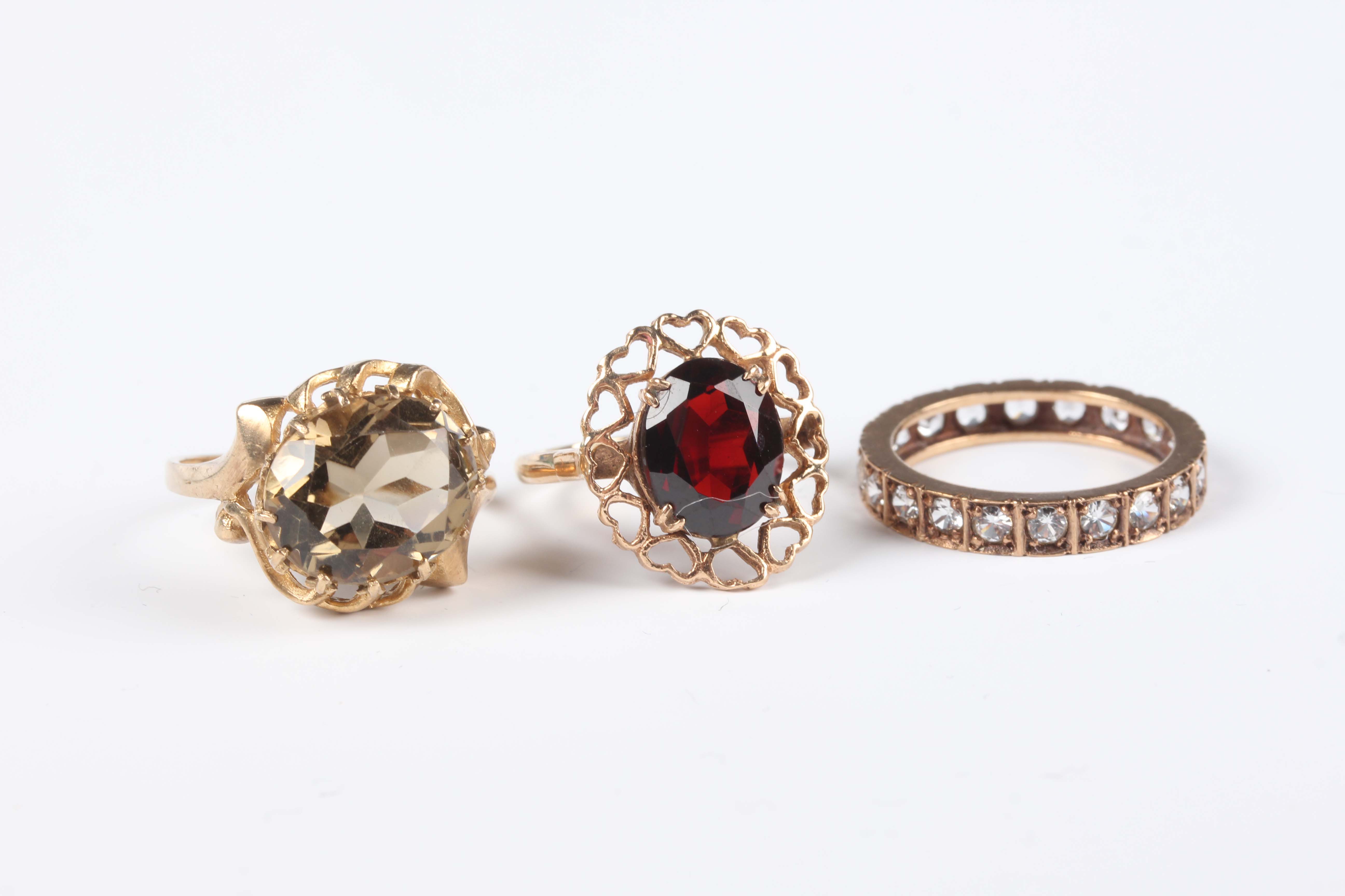 A 9ct gold ring, claw set with an oval cut smoky quartz in a slanting design, London 1979, ring size approx M, another 9ct gold ring, claw set with an oval cut garnet, and a gold and colourless gem set eternity ring, detailed ‘9ct’, total weight 8g.