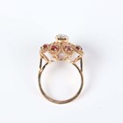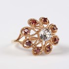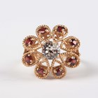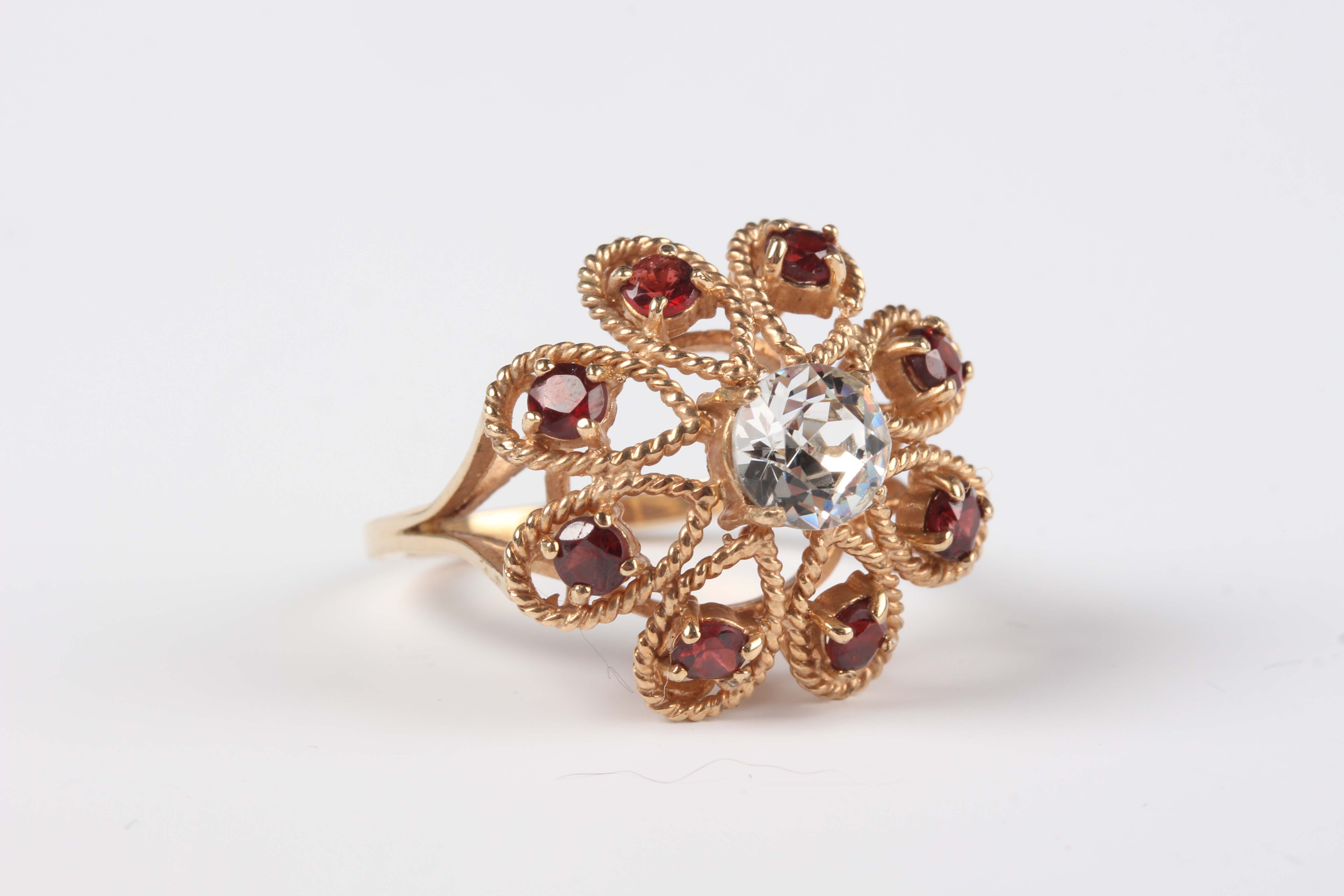A 9ct gold ring, claw set with a colourless paste within a surround of eight circular cut garnets, London 1973, weight 4.9g, ring size approx P.