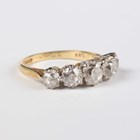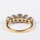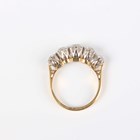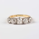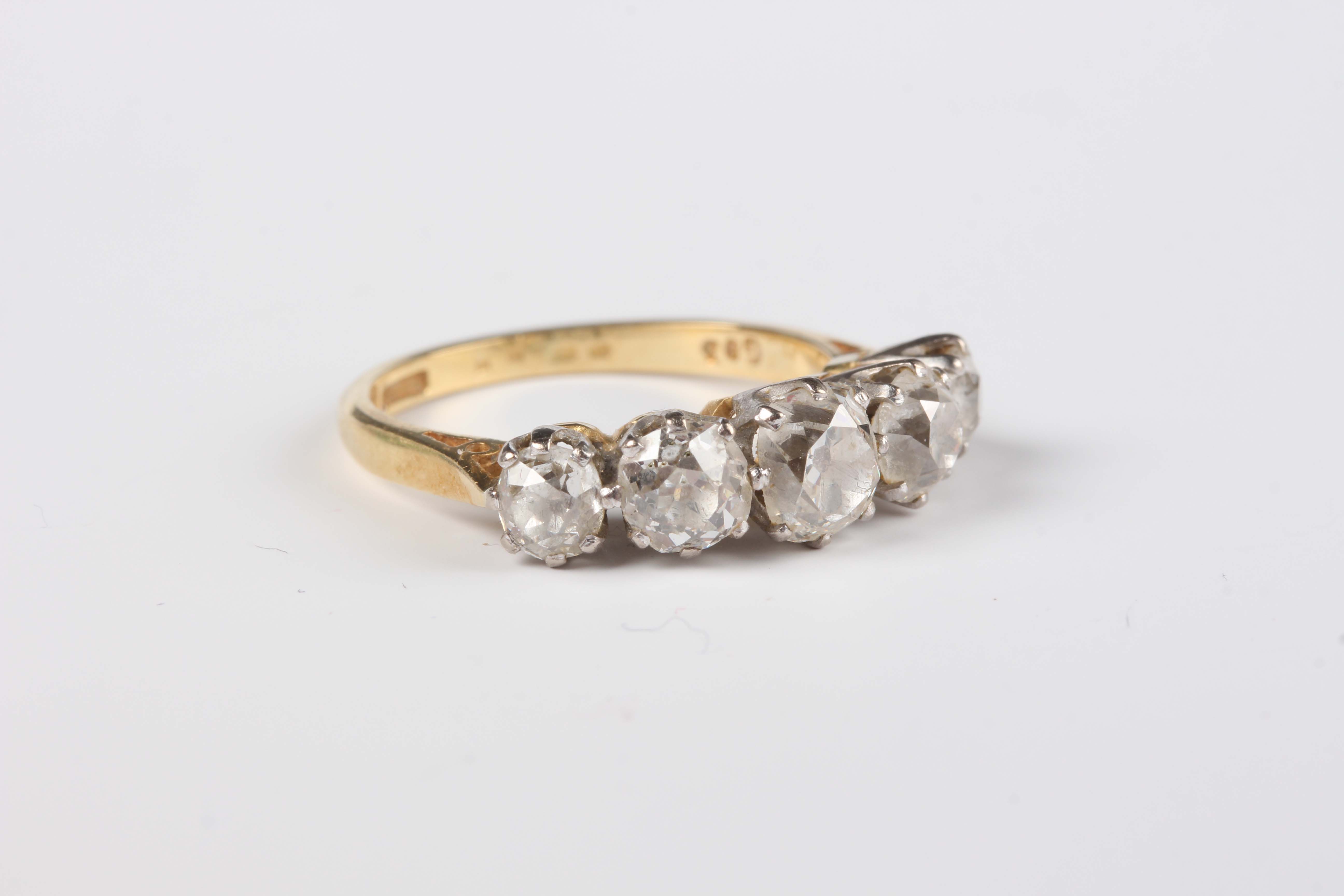 An 18ct gold and diamond five stone ring, claw set with a graduated row of old cut cushion shaped diamonds, Birmingham 1988, weight 3.6g, total diamond weight approx 1.80-2.20ct, ring size approx L1/2, with a case.