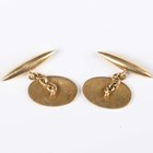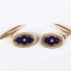 A pair of gold and enamelled cufflinks, each oval front with blue and white enamelled decoration, with torpedo shaped backs, detailed ‘18c’, weight 7.3g, dimensions of each front 1.9cm x 1.2cm.