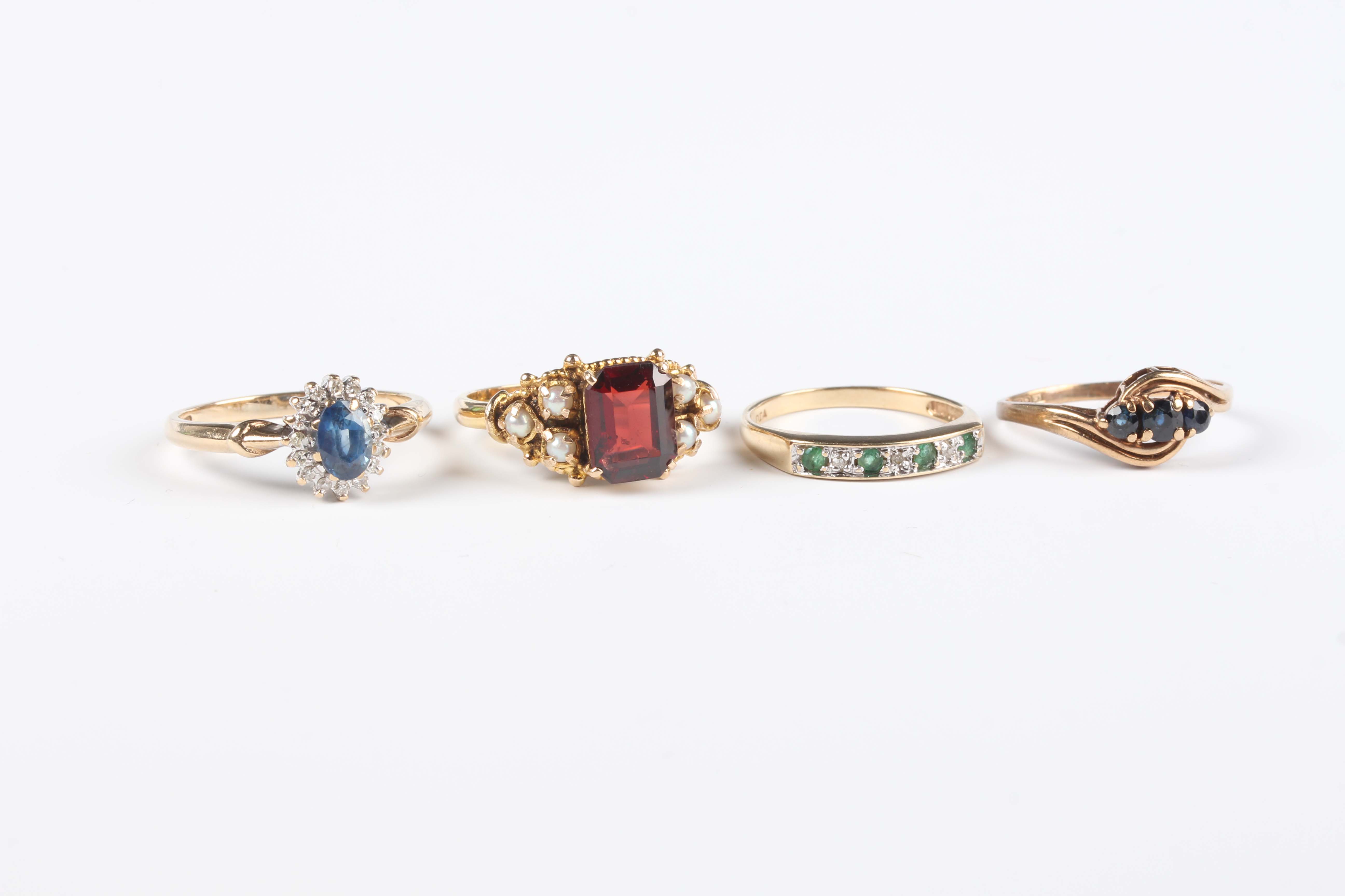 A gold ring, claw set with a cut cornered rectangular garnet between cultured pearl set shoulders, detailed ‘9ct’, ring size approx N1/2, a 9ct gold, sapphire and diamond oval cluster ring, a 9ct gold and sapphire three stone ring in a crossover design, total weight 7.1g and a gold, emerald and diamond half eternity ring, unmarked, weight 1.3g.