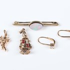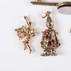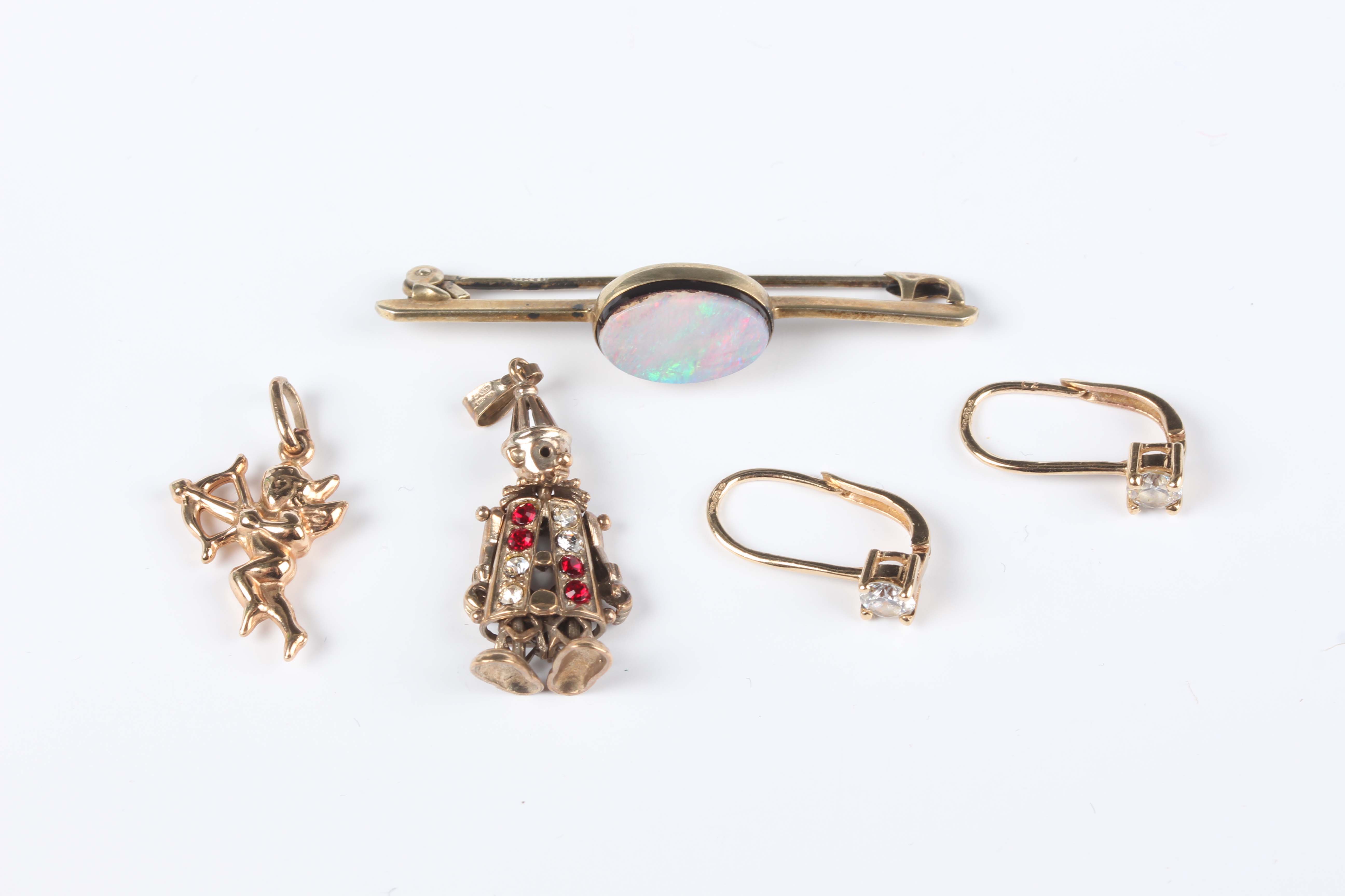 A 9ct gold and gem set pendant, designed as a clown, weight 2g, length 3cm, a pair of gold and colourless cubic zirconia solitaire earrings, unmarked, weight 1.4g, a gold cupid charm, unmarked, weight 0.7g, and a silver gilt and opal doublet bar brooch, detailed ‘830’, weight 2.3g.