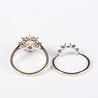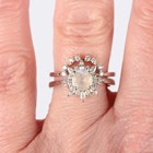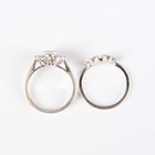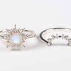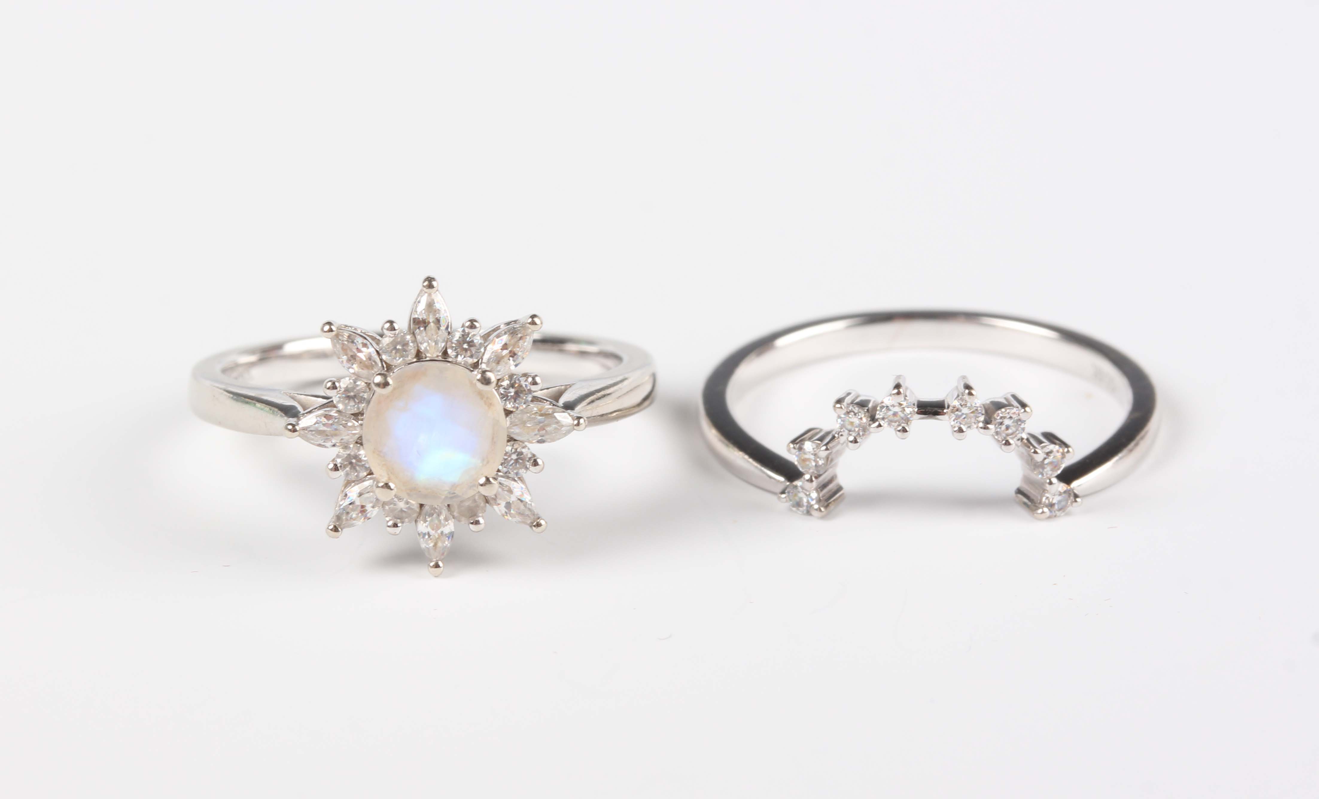 A white gold, moonstone and colourless gem set cluster ring in a starburst shaped design, detailed ‘G14K’, ring size approx M1/2, and a white gold and colourless gem set ring of curved design, detailed ‘G14K’, total weight 4.9g, ring size approx M1/2.