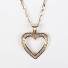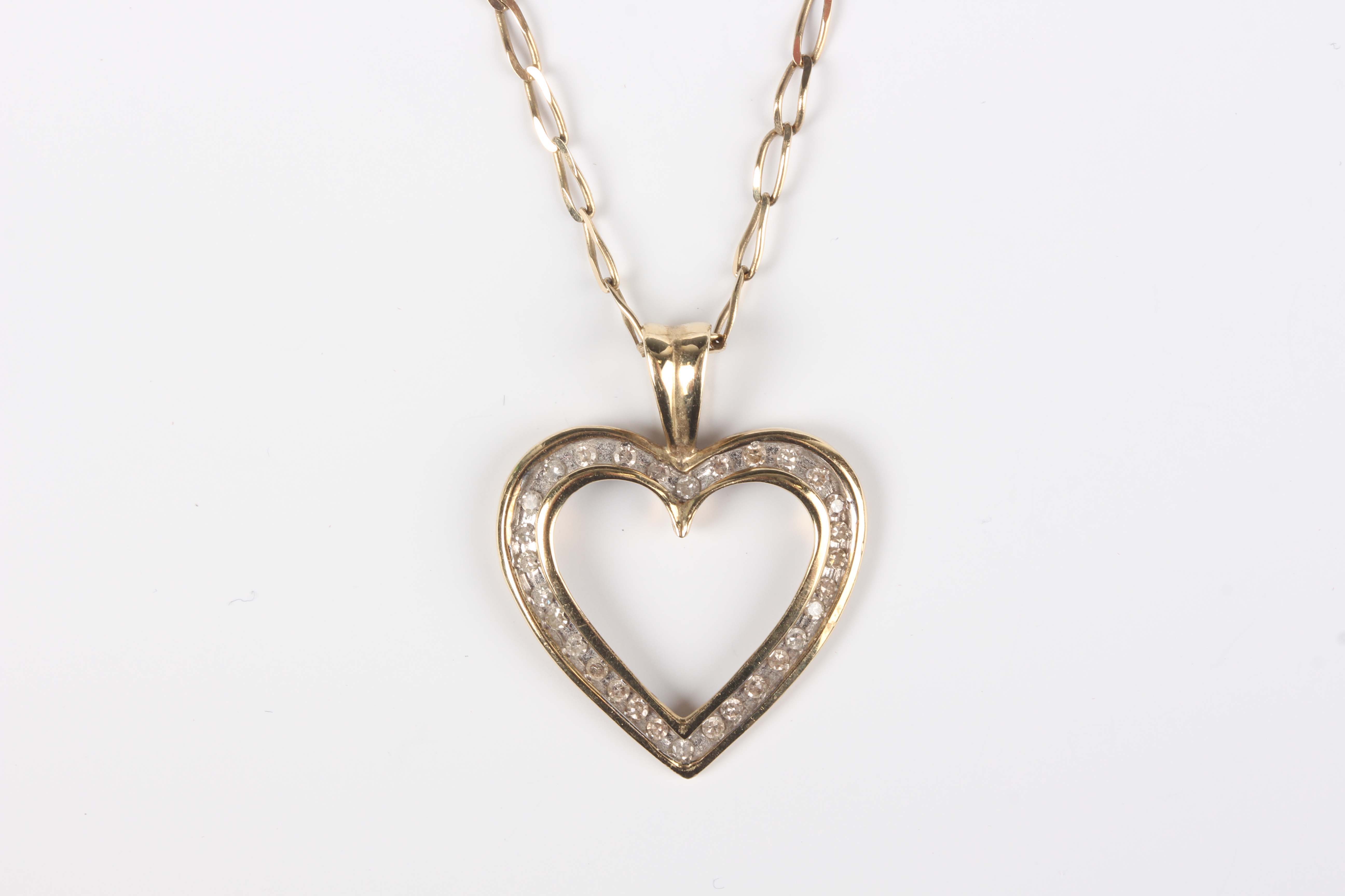 A 9ct gold and diamond heart shaped pendant, length 2.6cm, with a 9ct gold curblink neckchain on a boltring clasp, length 52.5cm, total weight 4.1g.