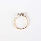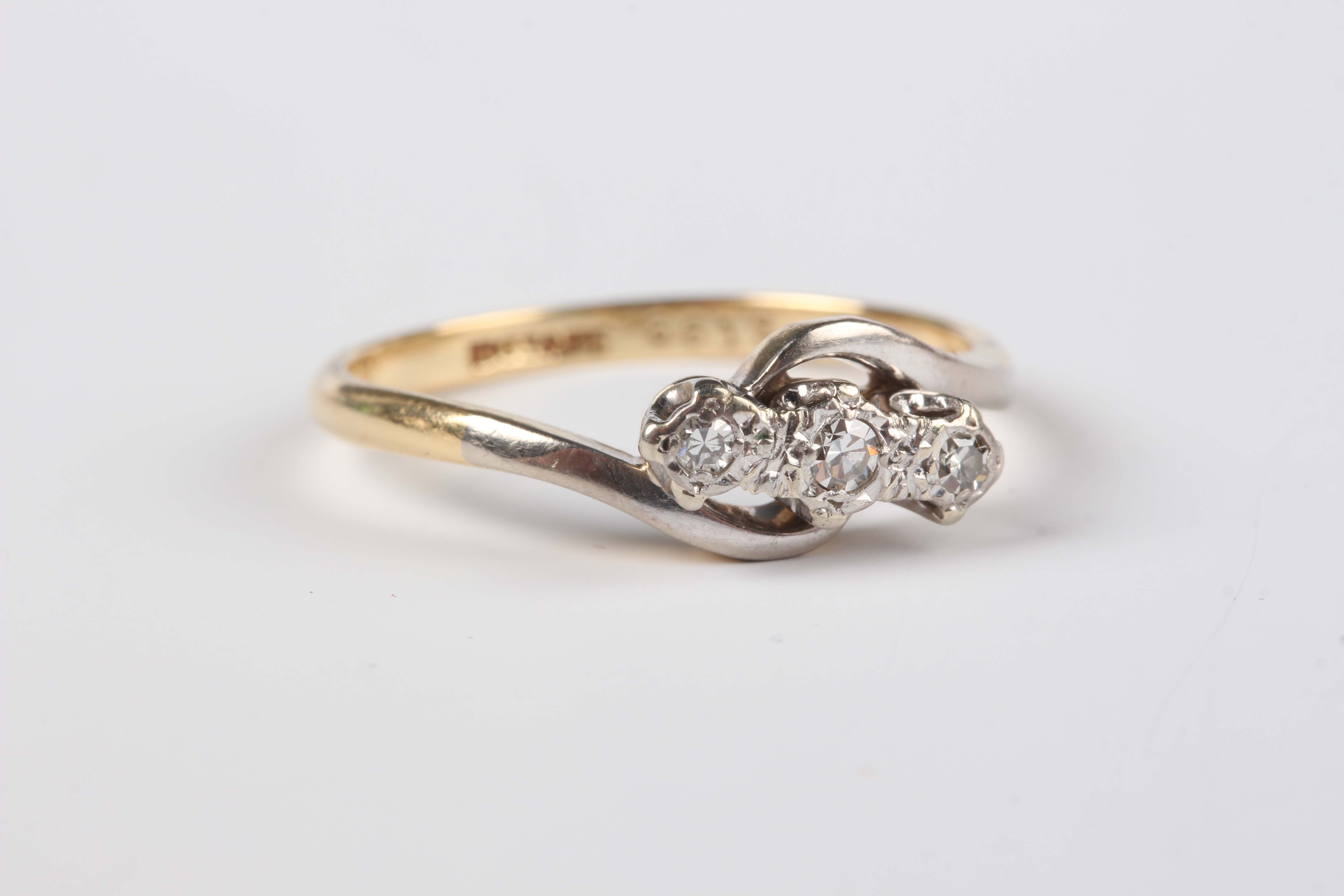 A gold, platinum and diamond three stone ring, mounted with circular cut diamonds in a crossover design, detailed ‘18ct & PT’, weight 2.7g, ring size approx N.