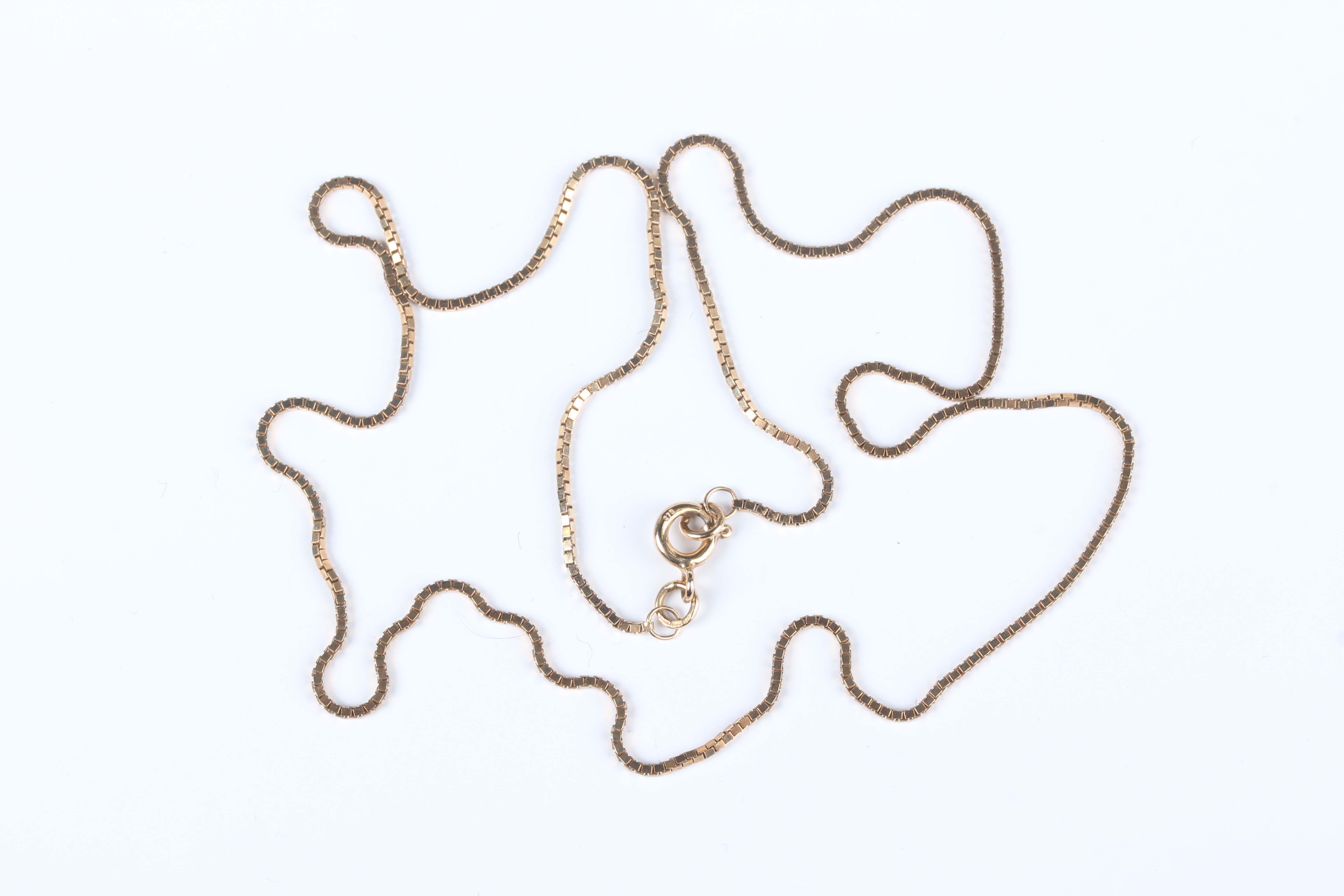 A 9ct gold box link neckchain on a boltring clasp, detailed ‘375’, weight 3g, length 45.5cm.