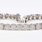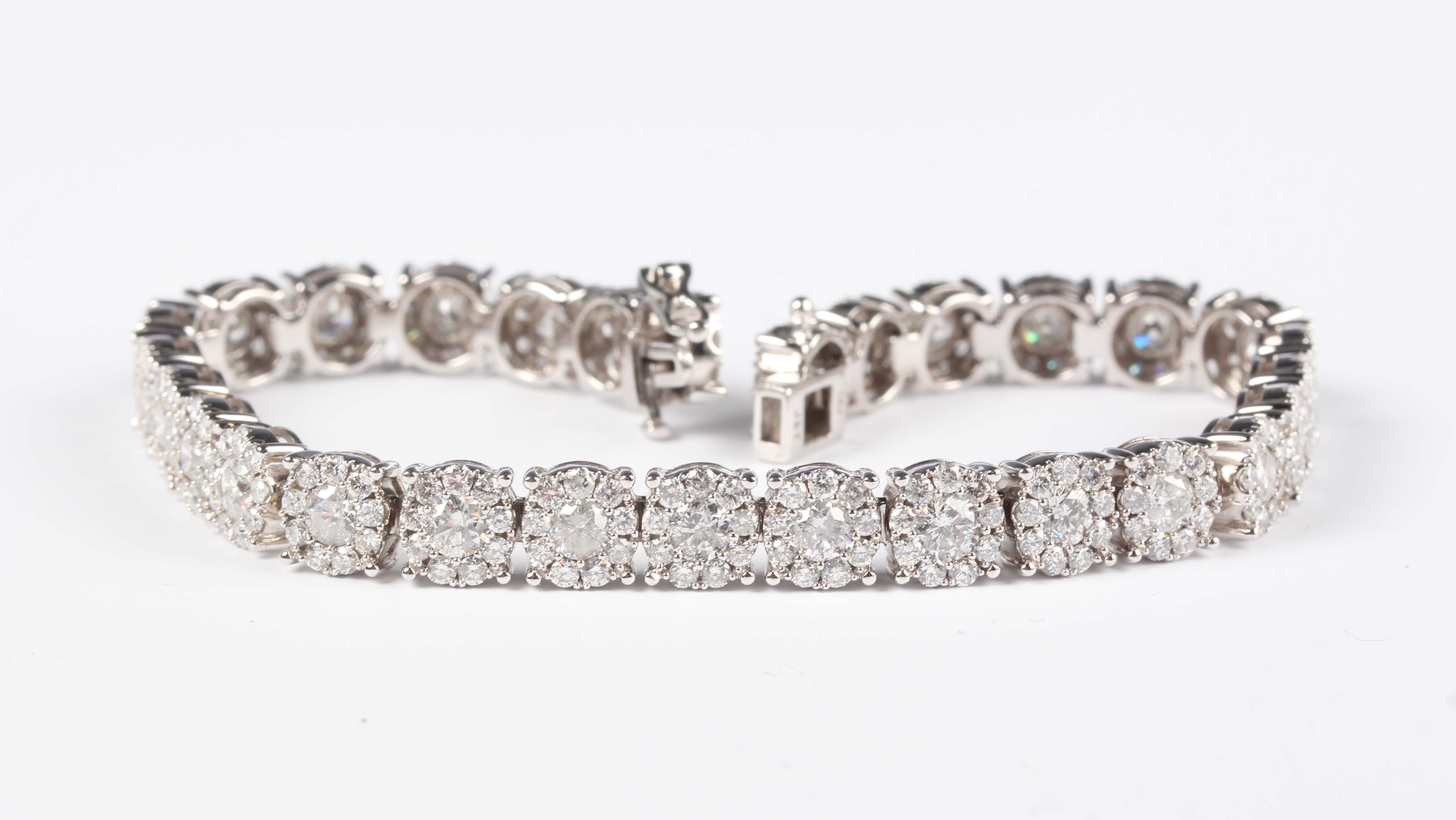 A 14ct white gold and diamond bracelet, formed as clusters of circular cut diamonds, on a snap clasp, weight 21.3g, total diamond weight 10.00ct, clarity grade SI2-I1, colour grade G-H, length 19cm, with a World Gemological Institute certificate, with a case.