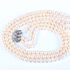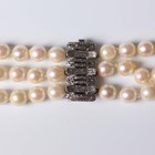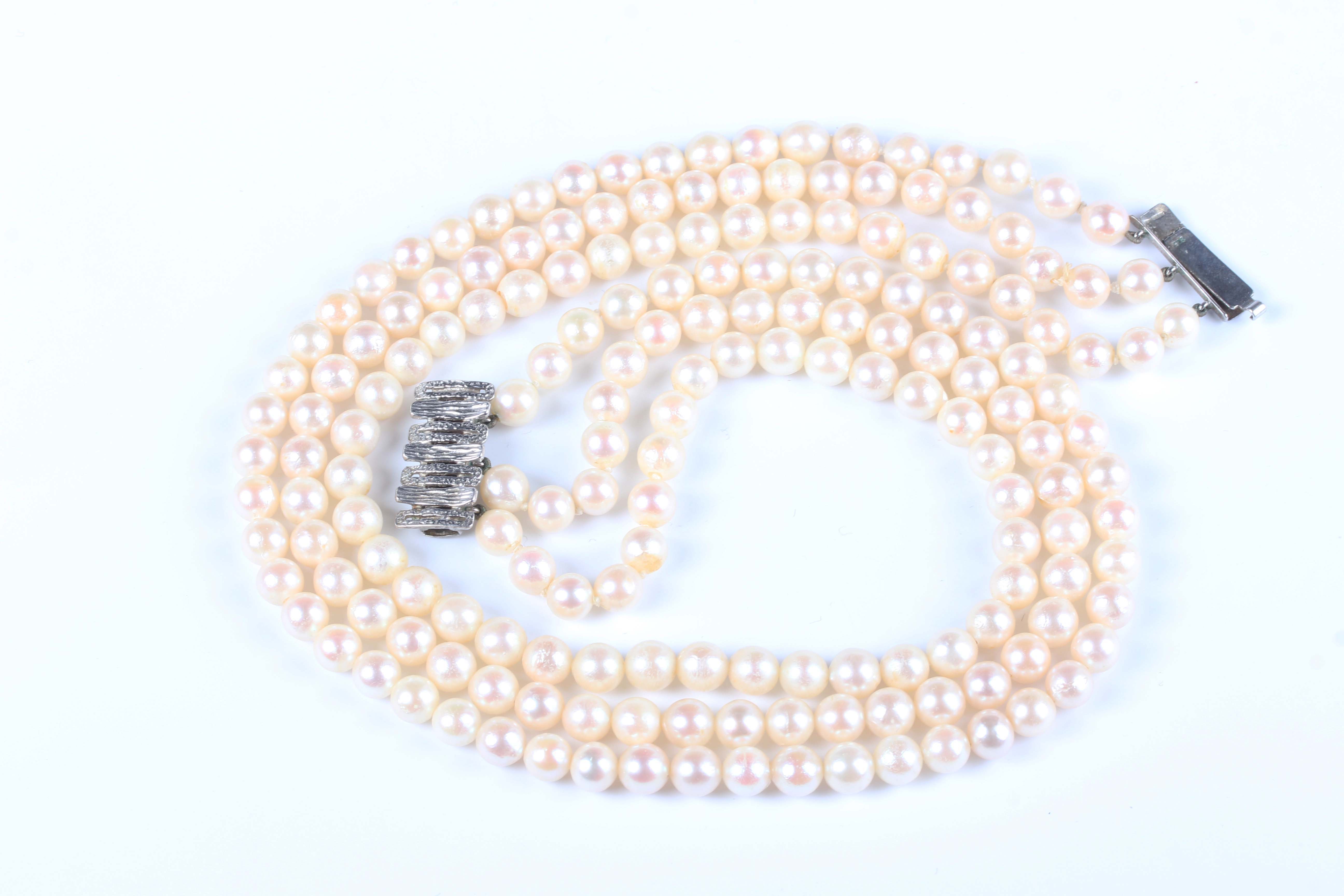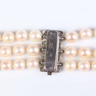 A graduated three row necklace of uniform cultured pearls on a silver rectangular textured clasp, import mark London 1980, length of shortest strand 38.5cm, with a case.