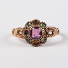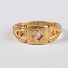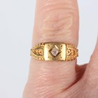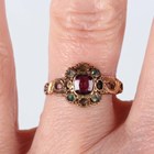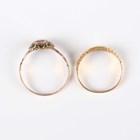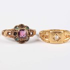 A Victorian 18ct gold ring, mounted with a cushion shaped diamond at the centre, Birmingham 1888, weight 2.3g, ring size approx J1/2 (shoulder gems lacking), and a Victorian 15ct gold ring, mounted with a central garnet within a green gem set surround, Birmingham 1864, weight 1.5g, ring size approx O (four gems lacking).