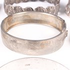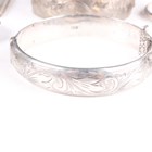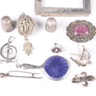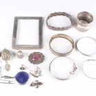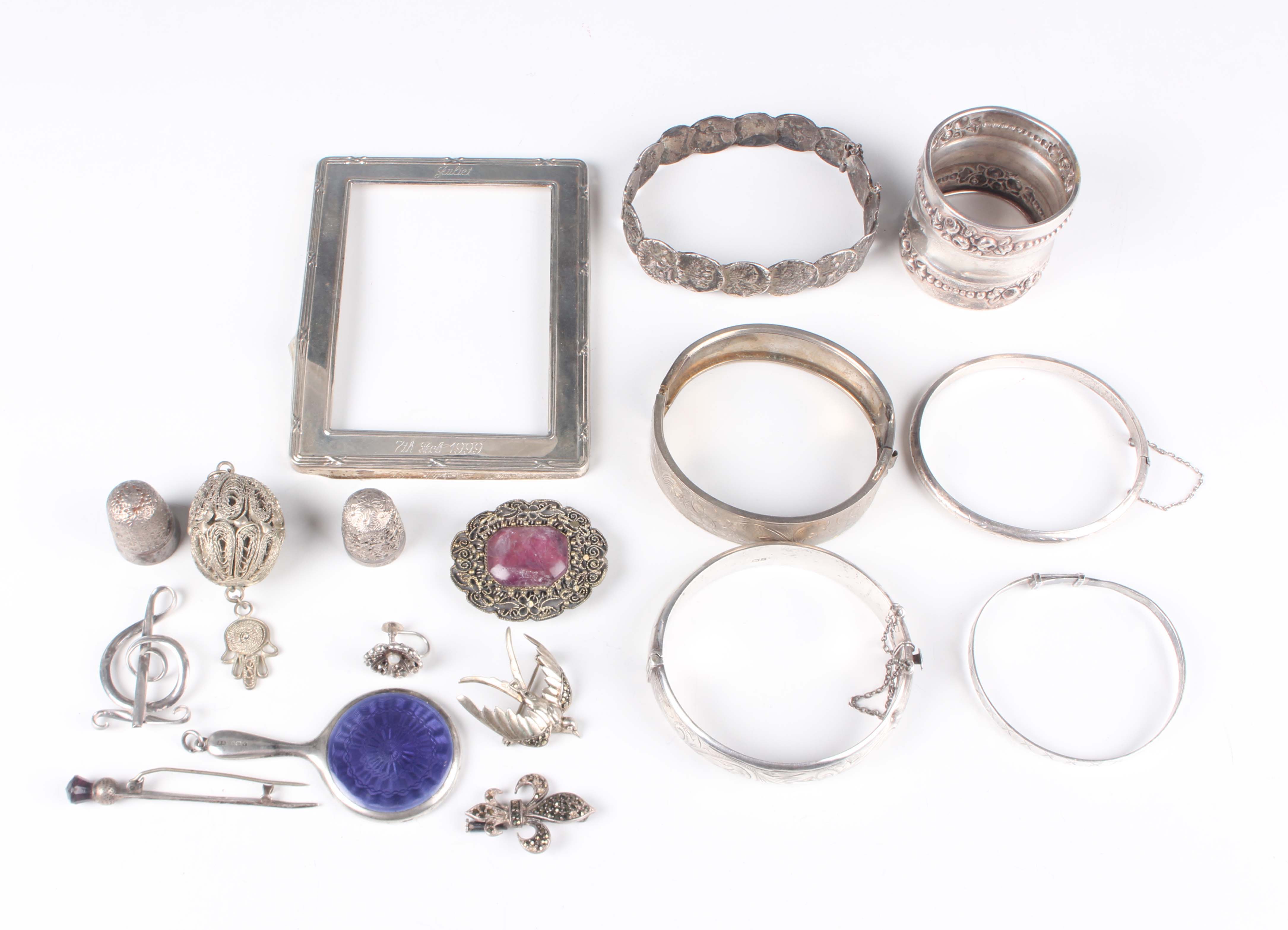 A group of jewellery, silver and other items, including a silver and mauve enamelled pendant mirror, Birmingham 1920, length 6.8cm, five bangles of various designs, three brooches, a napkin ring, import mark Birmingham 1930, and a silver frame mount.
