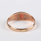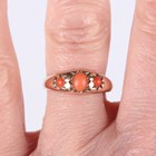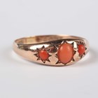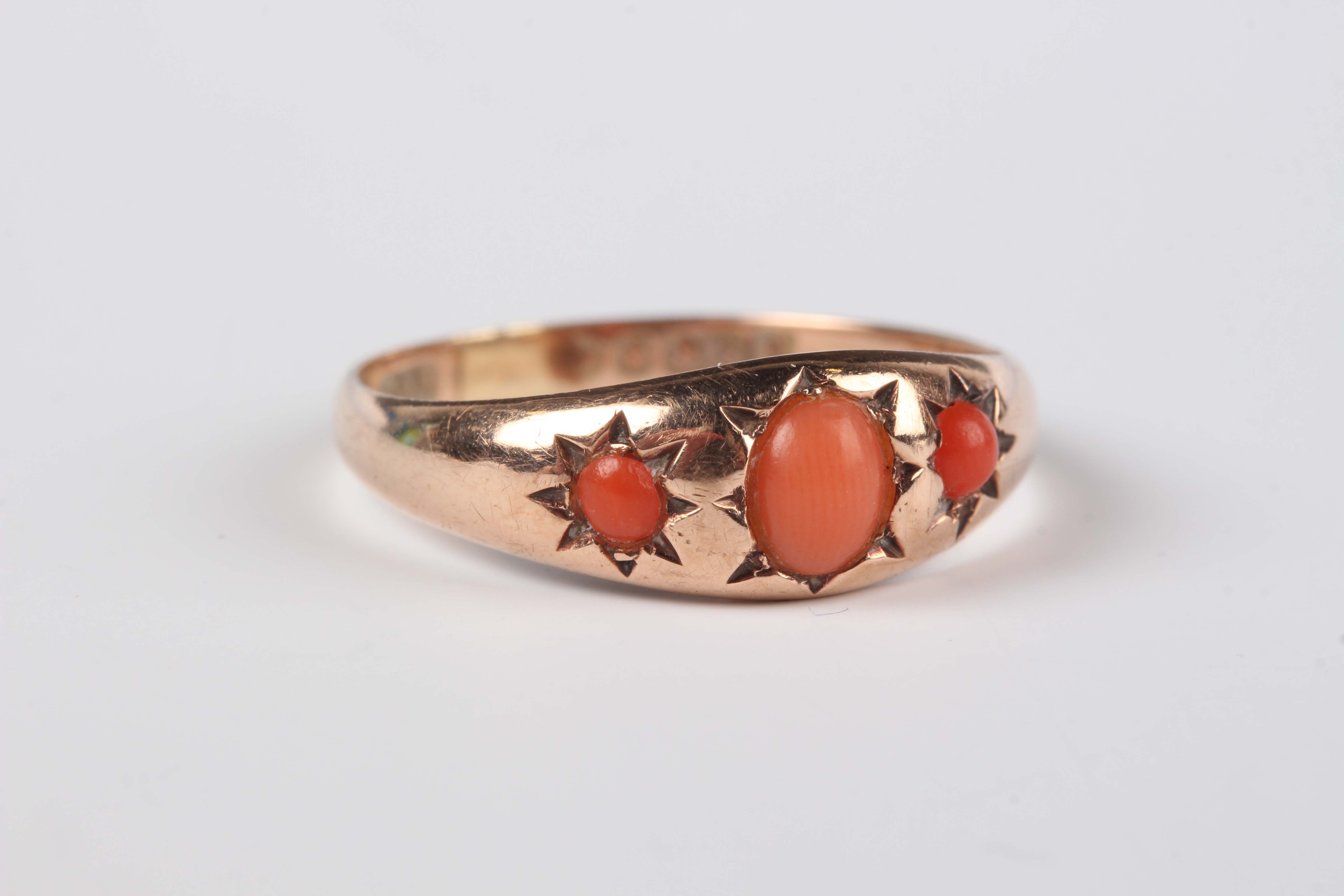 A 9ct gold ring, star gypsy set with a central oval coral between two circular corals, Chester 1911, weight 2.1g, ring size approx P1/2.