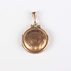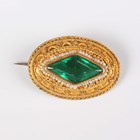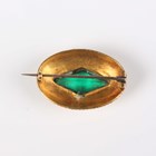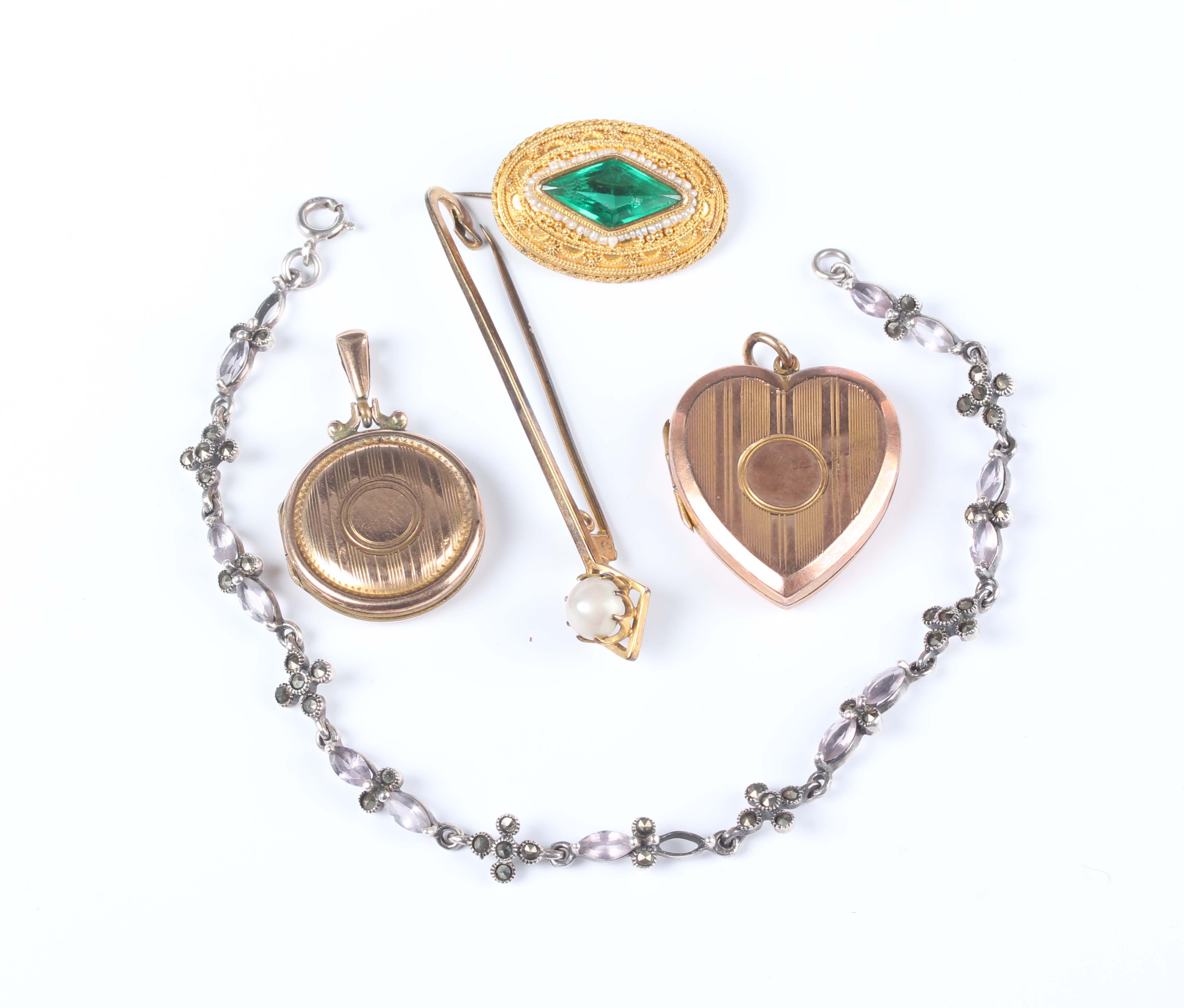 A group of jewellery, comprising a gold bar brooch, mounted with a half-pearl, detailed ‘18ct’, weight 3.1g, diameter of half-pearl 6.4mm, a gold back and front heart shaped pendant locket, a gold back and front circular pendant locket, total weight 8.2g, a green paste and seed pearl set oval brooch and a gem set bracelet.