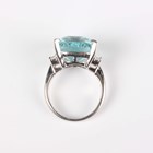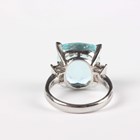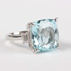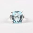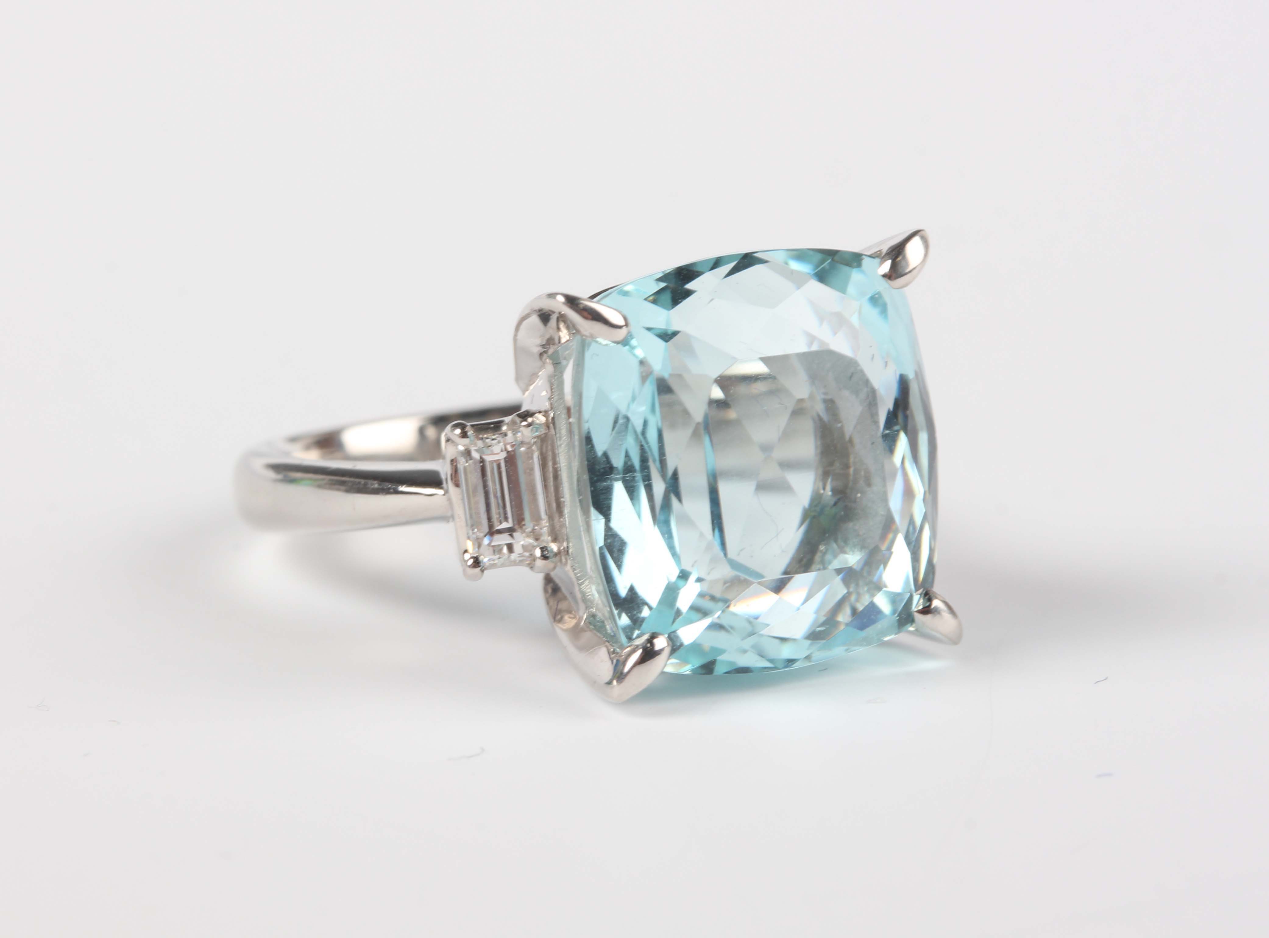 A platinum, aquamarine and diamond ring, claw set with a large cushion shaped aquamarine between baguette cut diamond single stone shoulders, weight 9.9g, aquamarine weight approx 11.38ct, total diamond weight approx 0.45ct, ring size approx M.
