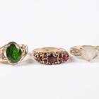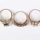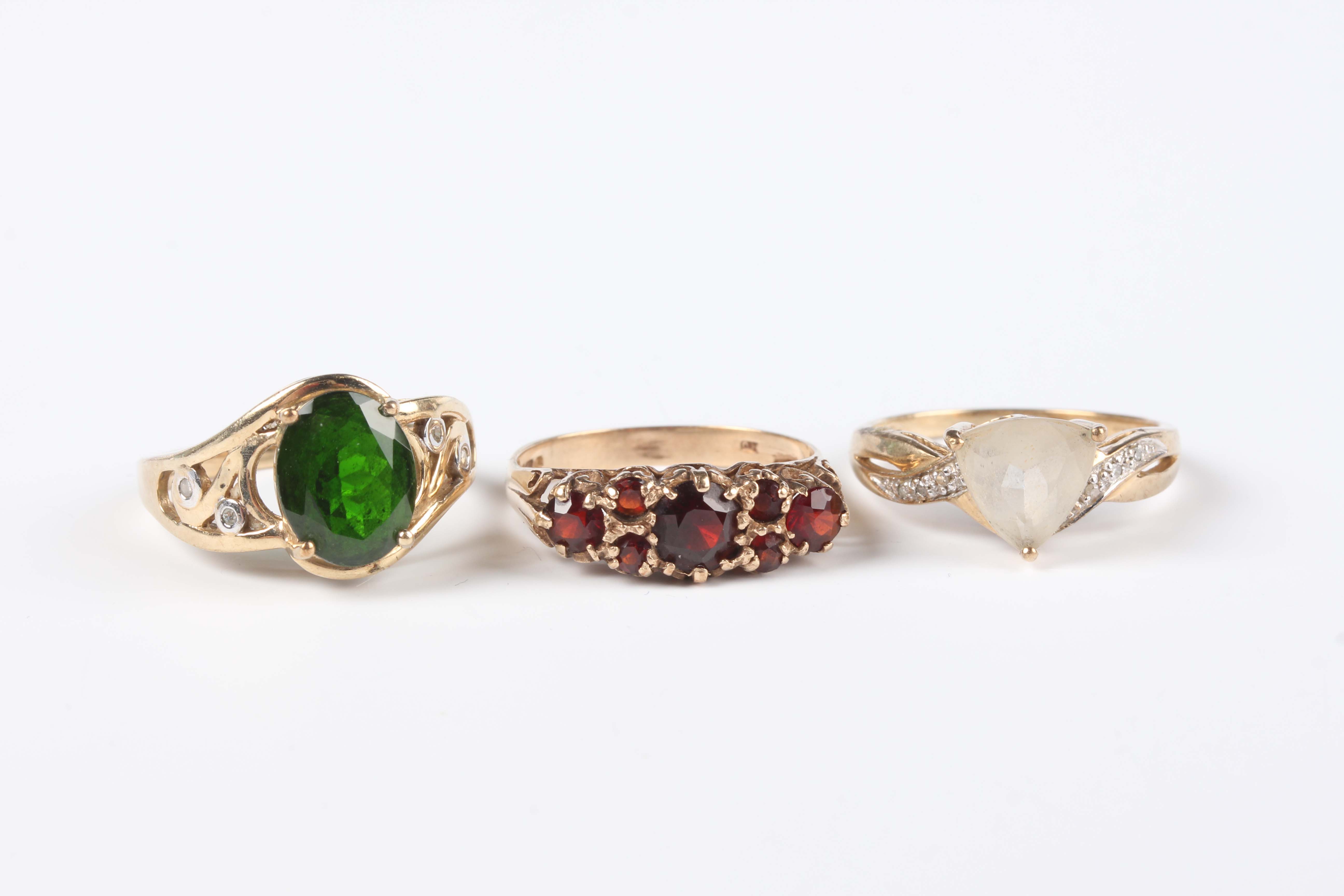 A 9ct gold and garnet seven stone ring, London 1979, ring size approx N1/2, a 9ct gold ring, claw set with an oval cut green diopside between diamond two stone shoulders, ring size approx N, and another 9ct gold ring, claw set with a curved triangular cut colourless gemstone between diamond three stone shoulders, total weight 8.1g.