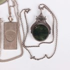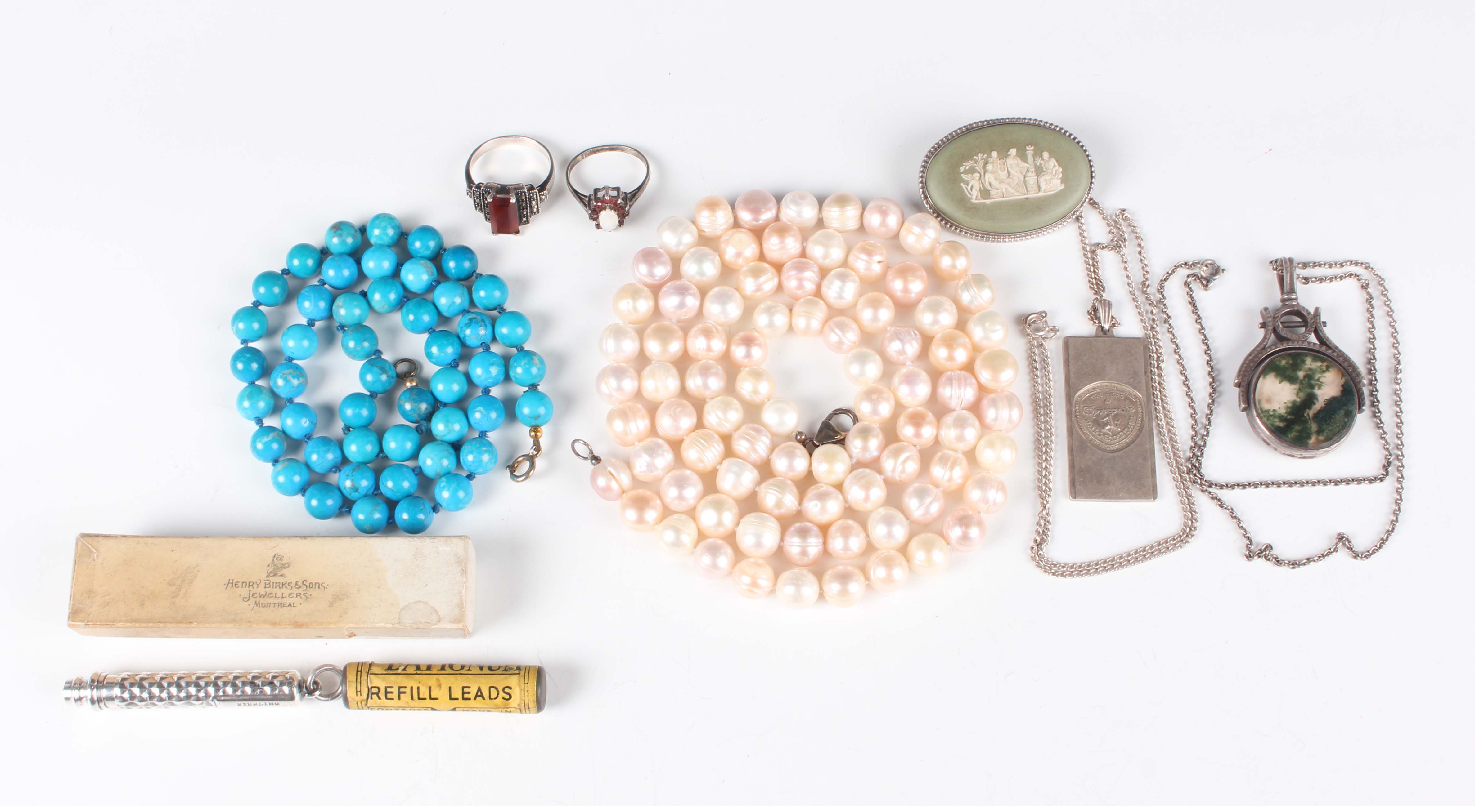 A group of jewellery, including a silver and moss agate twin-sided rotating pendant fob, weight 15.1g, length 4.9cm, a silver rectangular pendant commemorating 1000 years of the government of the Isle of Man, with a silver neckchain, total weight 15.8g, a Wedgwood green jasperware oval brooch and a garnet and opal oval cluster ring, together with a sterling silver cased propelling pencil, with a quantity of Platignum refill leads.