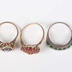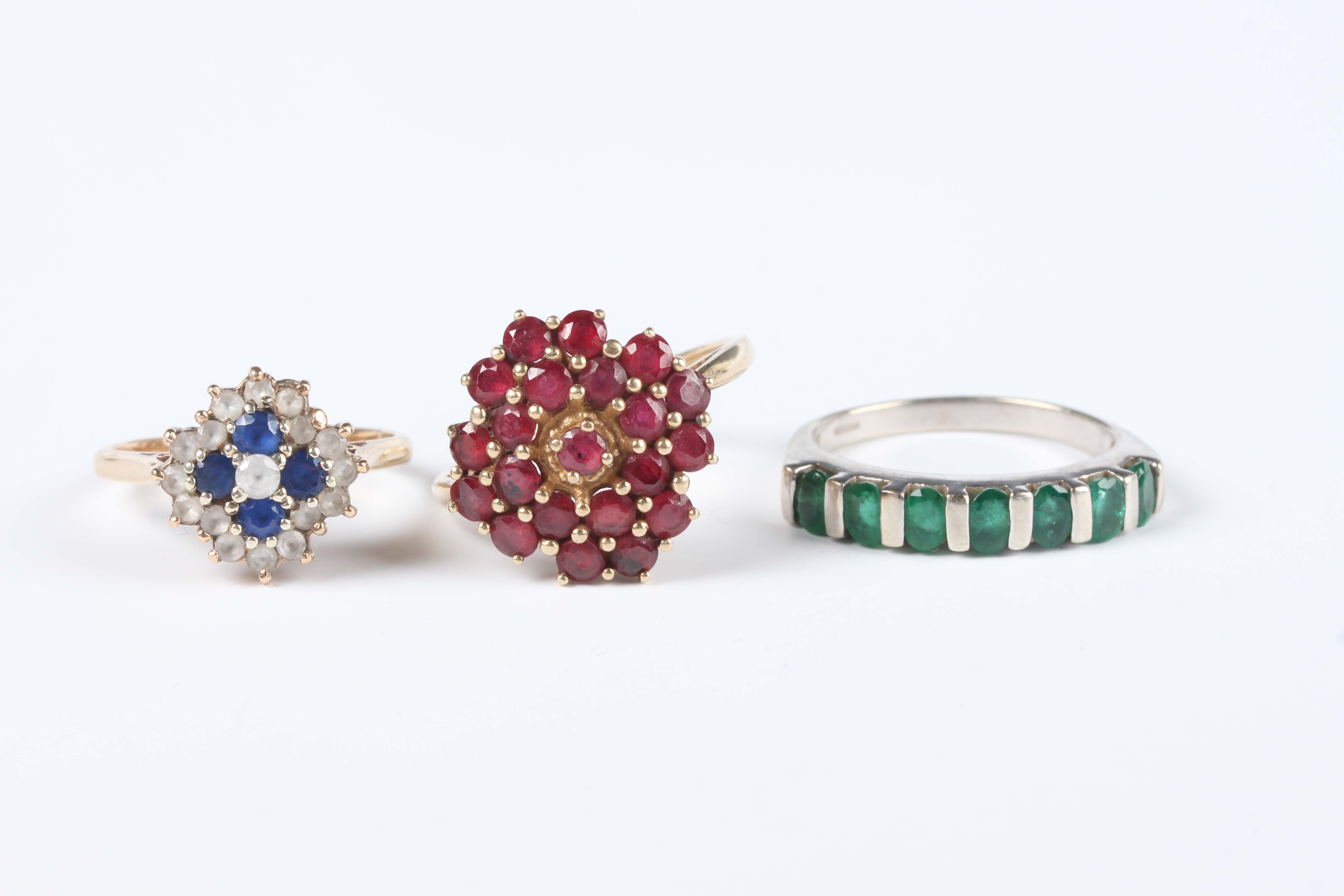A 9ct gold and ruby cluster ring, mounted with circular cut rubies, ring size approx T1/2, a 9ct white gold and emerald seven stone half hoop ring, mounted with a row of oval cut emeralds, ring size approx S, and a gold, blue and colourless gem set cluster ring, detailed ‘9ct GOLD’, total weight 11.6g.