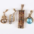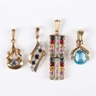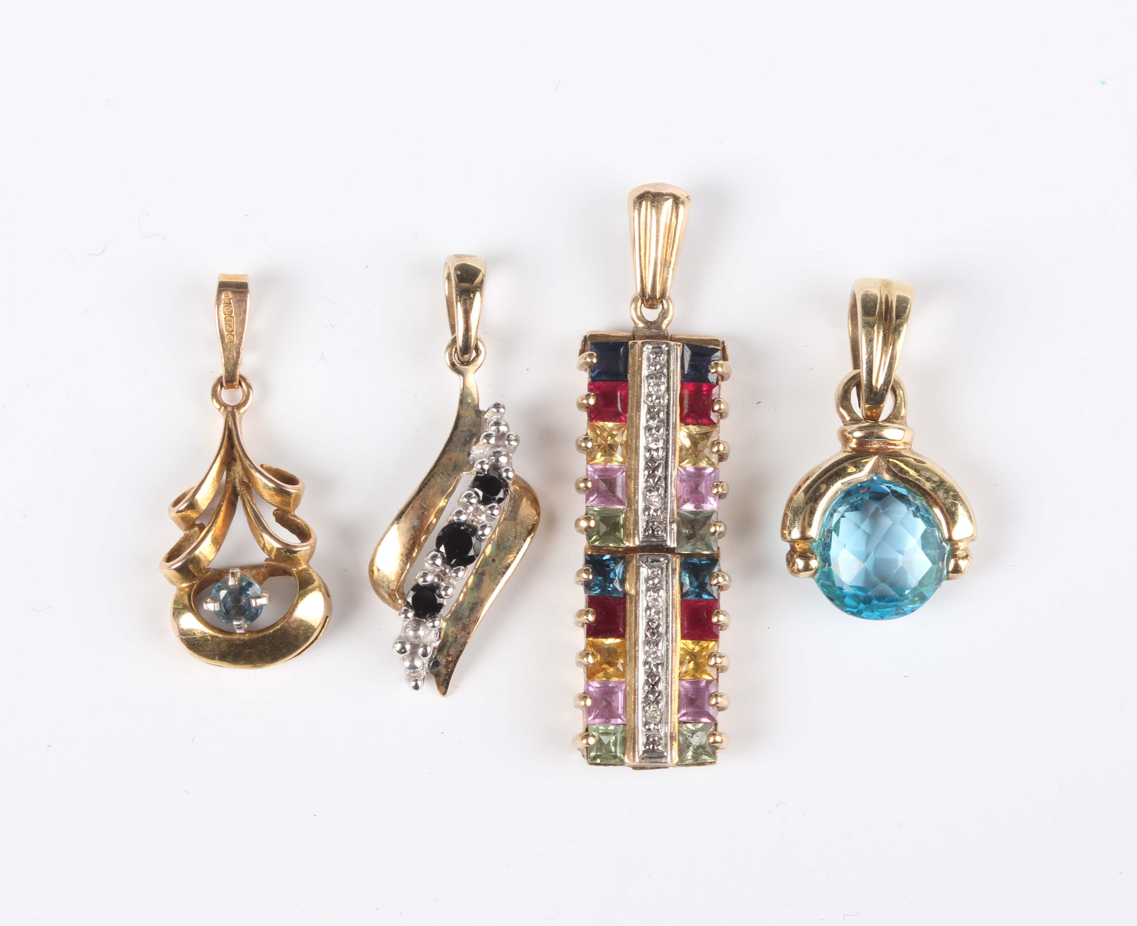 A gold, diamond and varicoloured gemstone pendant of twin section rectangular form, unmarked, weight 2.7g, length 3.2cm, a 9ct gold, diamond and gem set pendant in a twist design, a 9ct gold and blue topaz pendant and another 9ct gold and blue gem set pendant, total weight 3.8g.
