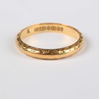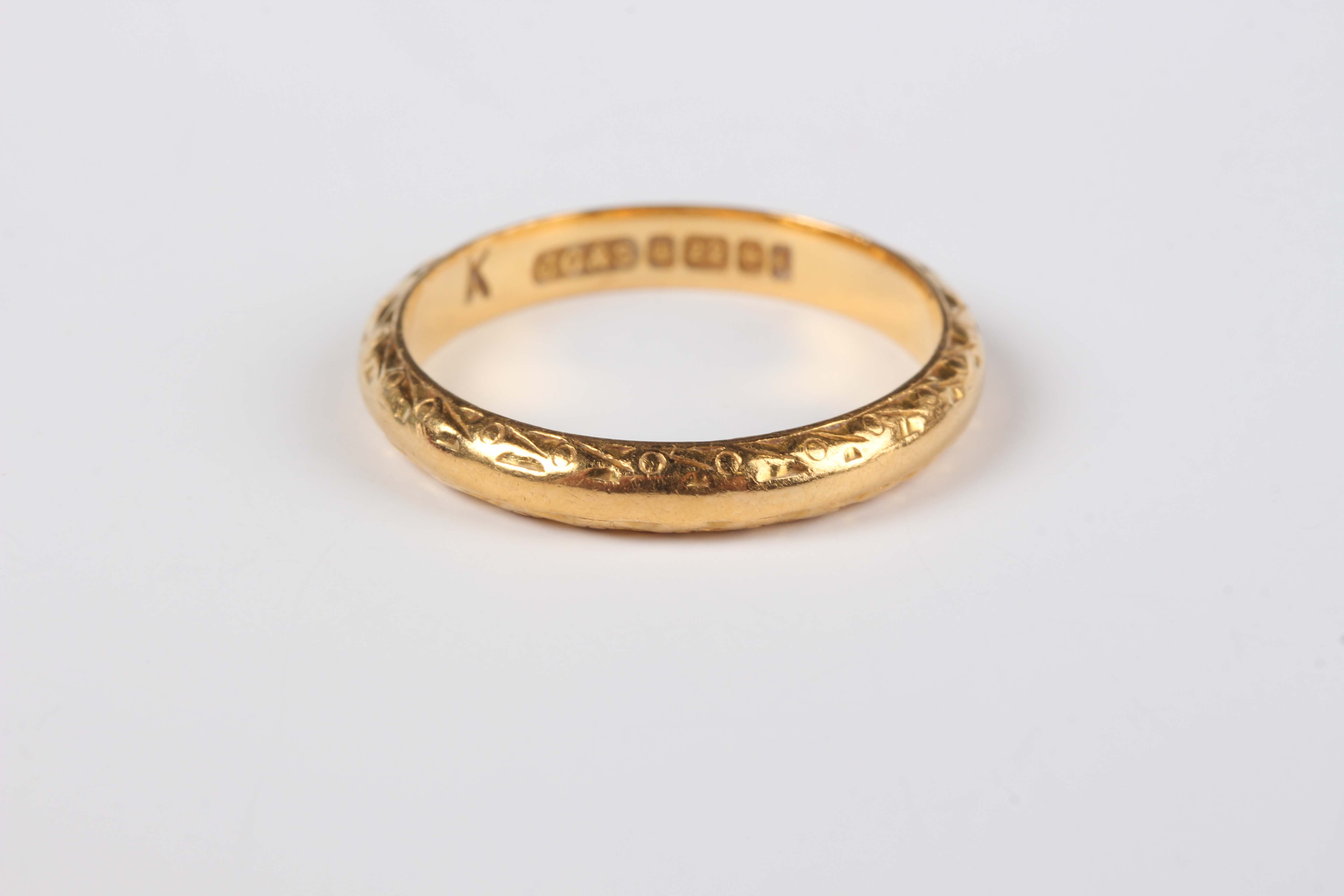 A 22ct gold wedding ring with engraved decoration, Birmingham 1959, weight 3g, ring size approx J1/2.