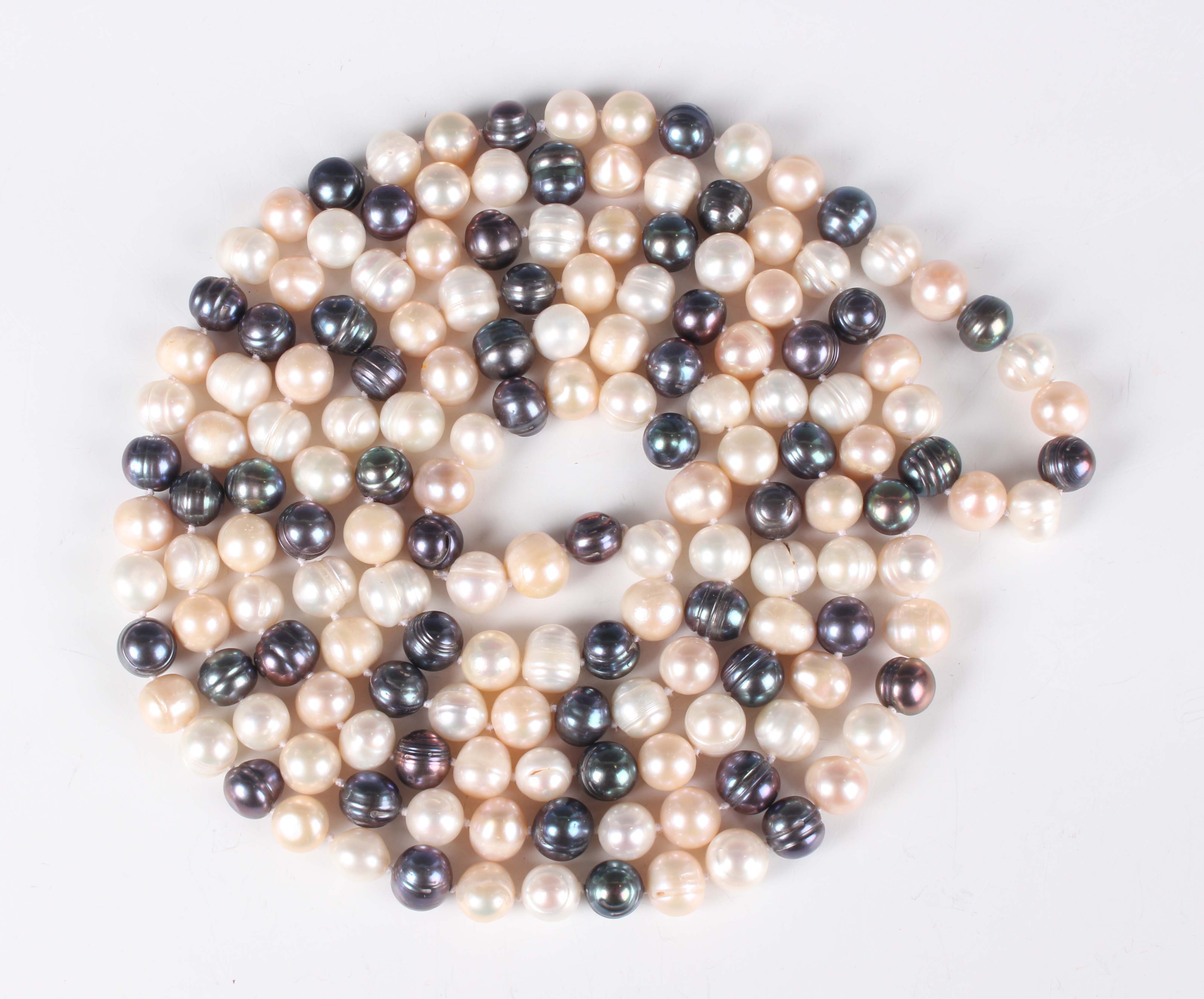 A single row necklace of varicoloured freshwater cultured pearls, including grey and light pink tinted, length 168cm.