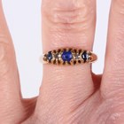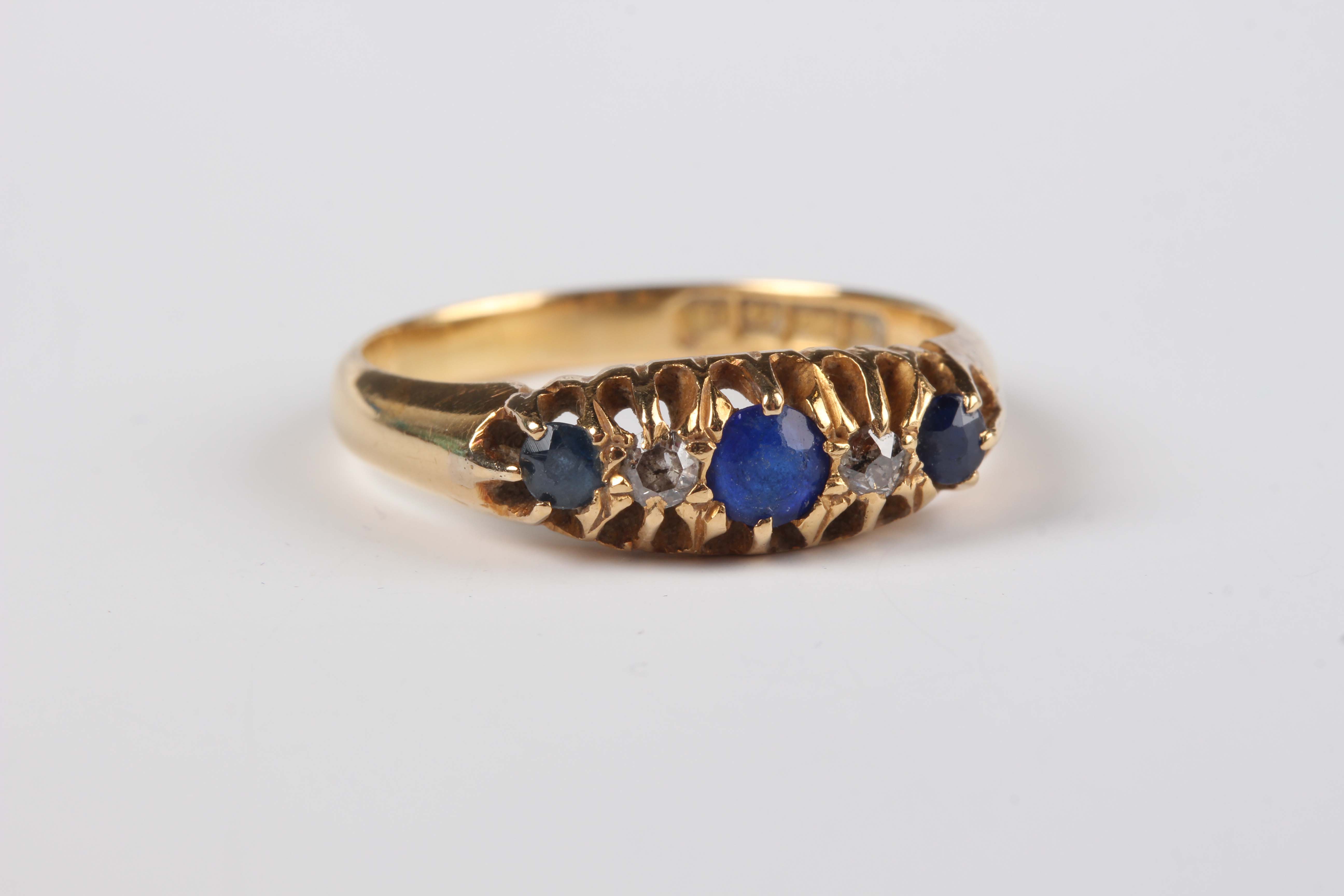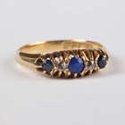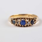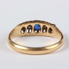 An 18ct gold ring, mounted with two diamonds, a synthetic blue spinel and two sapphires, Birmingham 1919, weight 3.4g, ring size approx M.