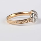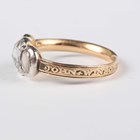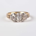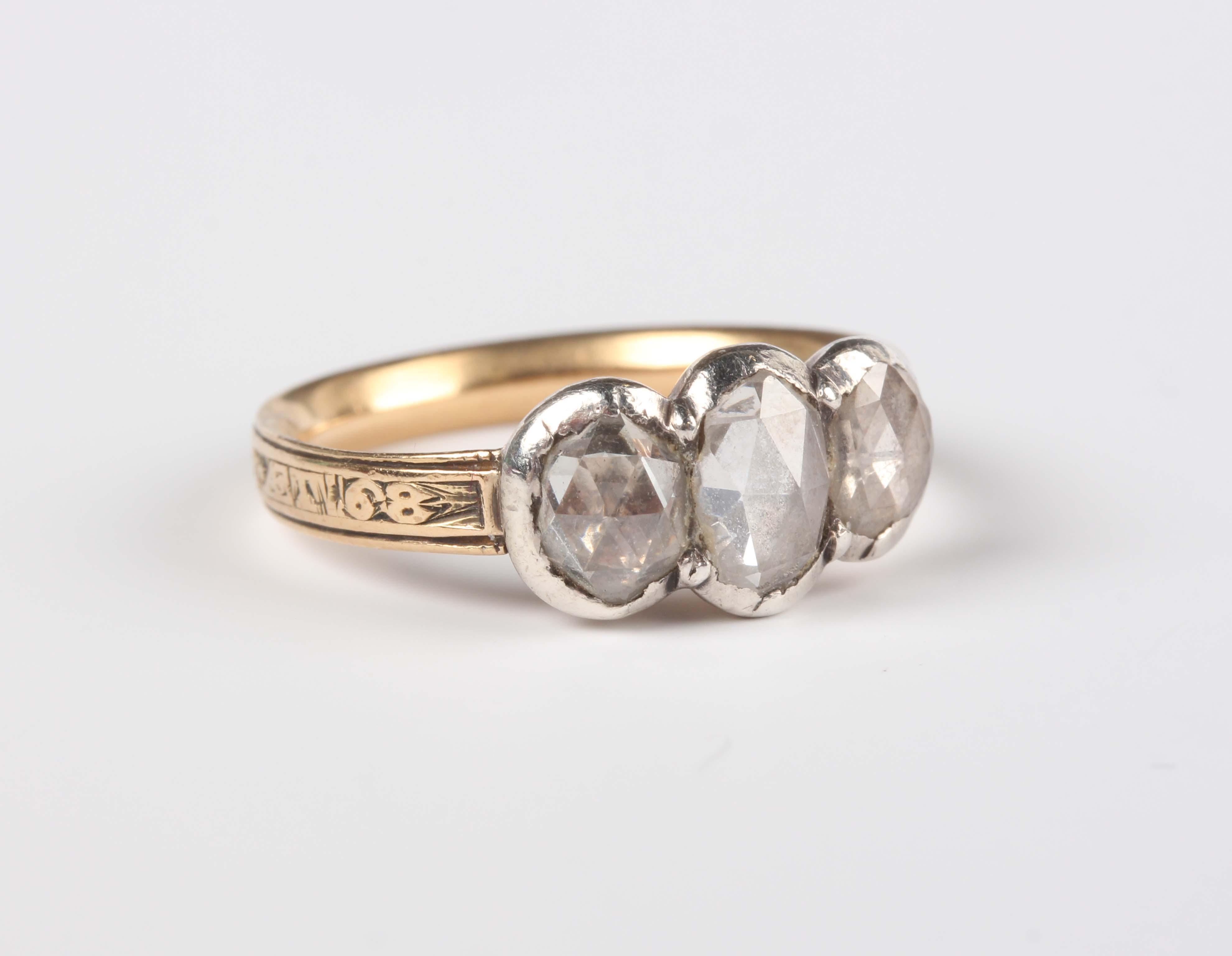 A George III gold, silver set and foil backed diamond mourning ring, collet set with three graduated rose cut foil backed diamonds, the shank inscribed ‘John Winso…12 AET 68’, weight 3.6g, ring size approx M, with a case.