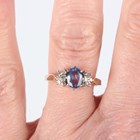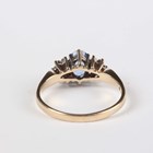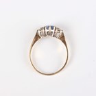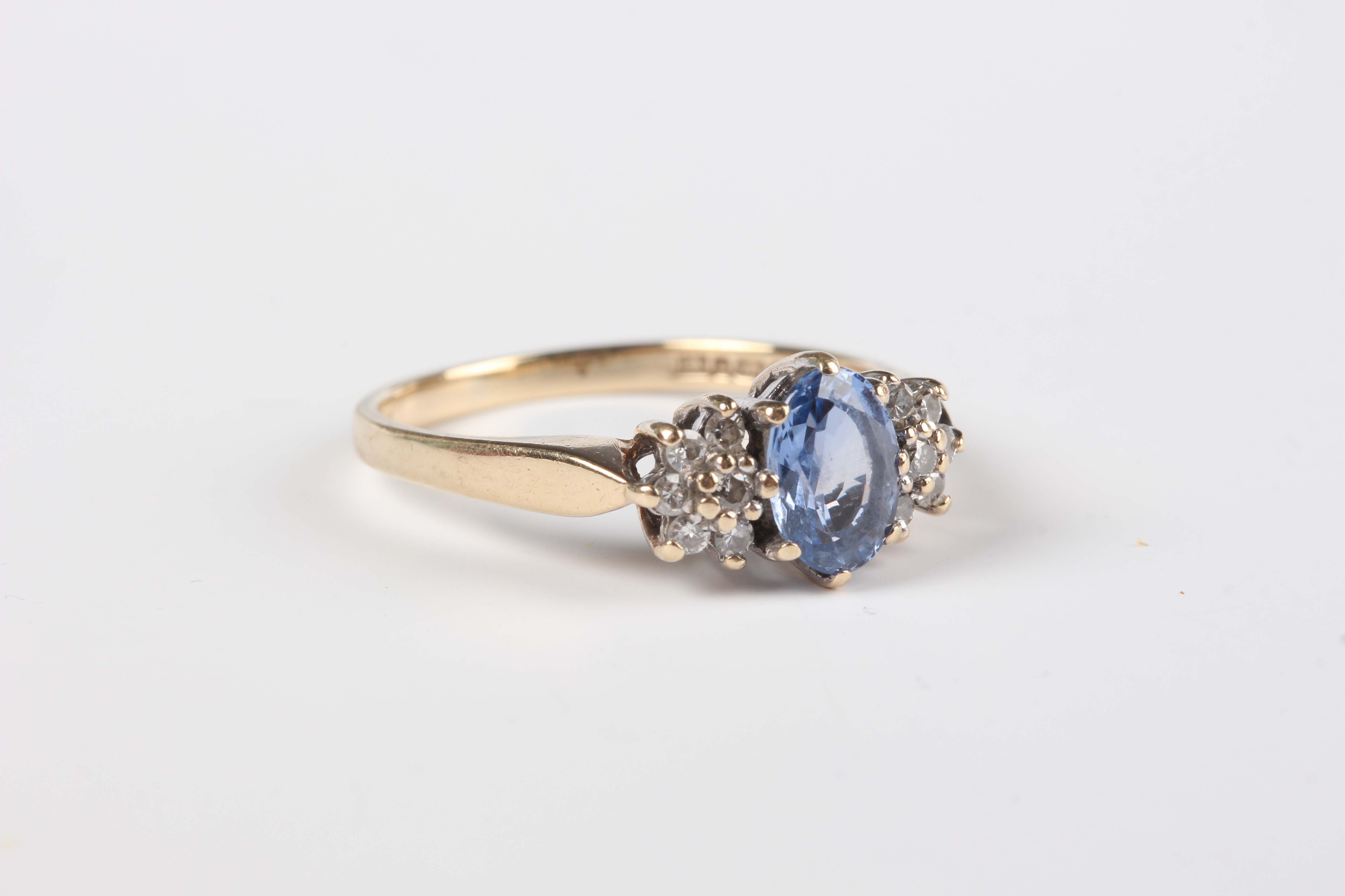 A 9ct gold, sapphire and diamond ring, claw set with the oval cut sapphire between circular cut diamond six stone shoulders, London 1989, weight 2.5g, ring size approx O1/2.