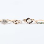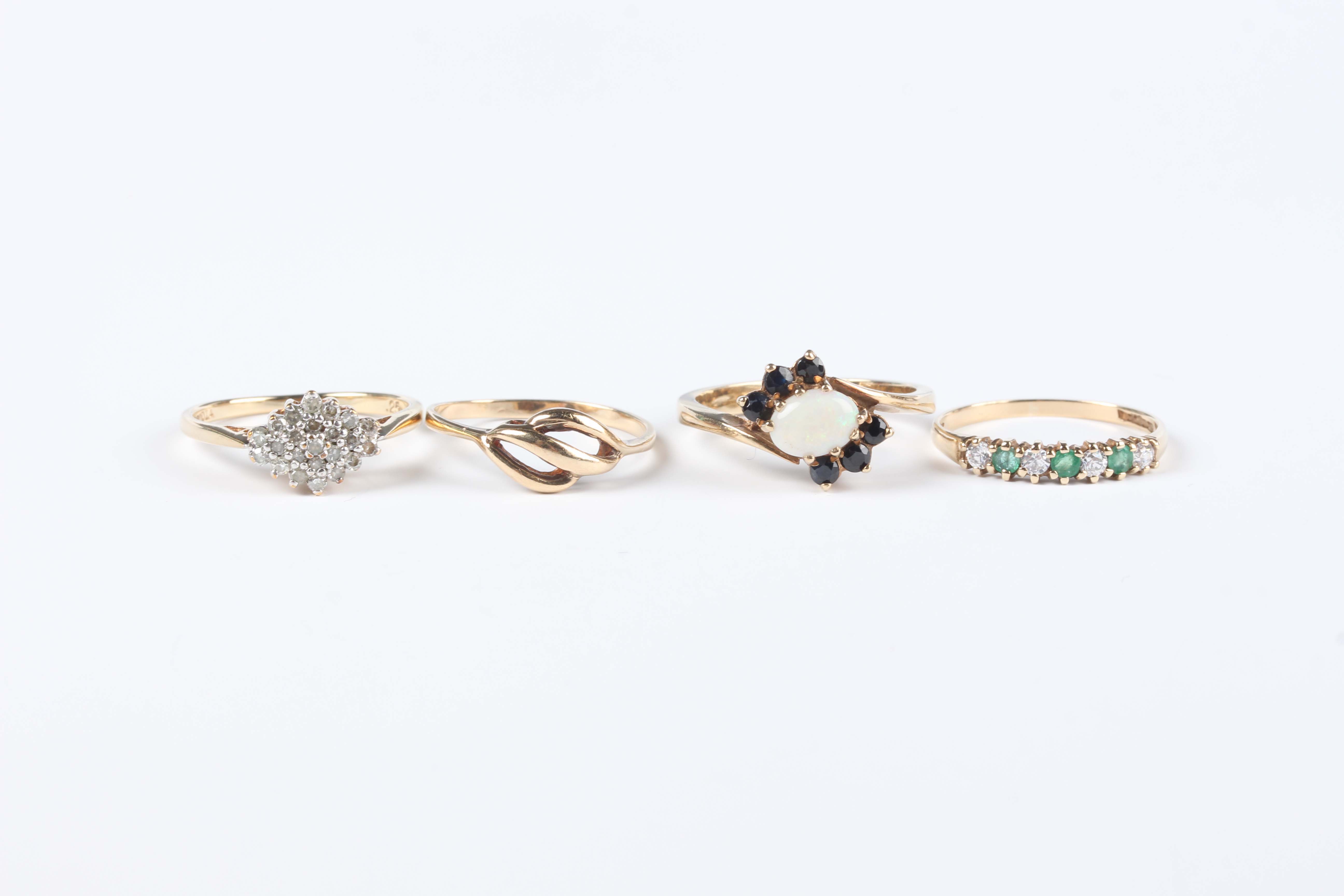 A 9ct gold, opal and sapphire ring, claw set with an oval opal between circular cut sapphire six stone shoulders, Birmingham 1995, ring size approx N1/2, a 9ct gold and diamond cluster ring, ring size approx M1/2, a 9ct gold, emerald and colourless cubic zirconia half hoop ring and another gold ring, detailed ‘9ct’, total weight 6.9g.