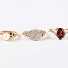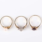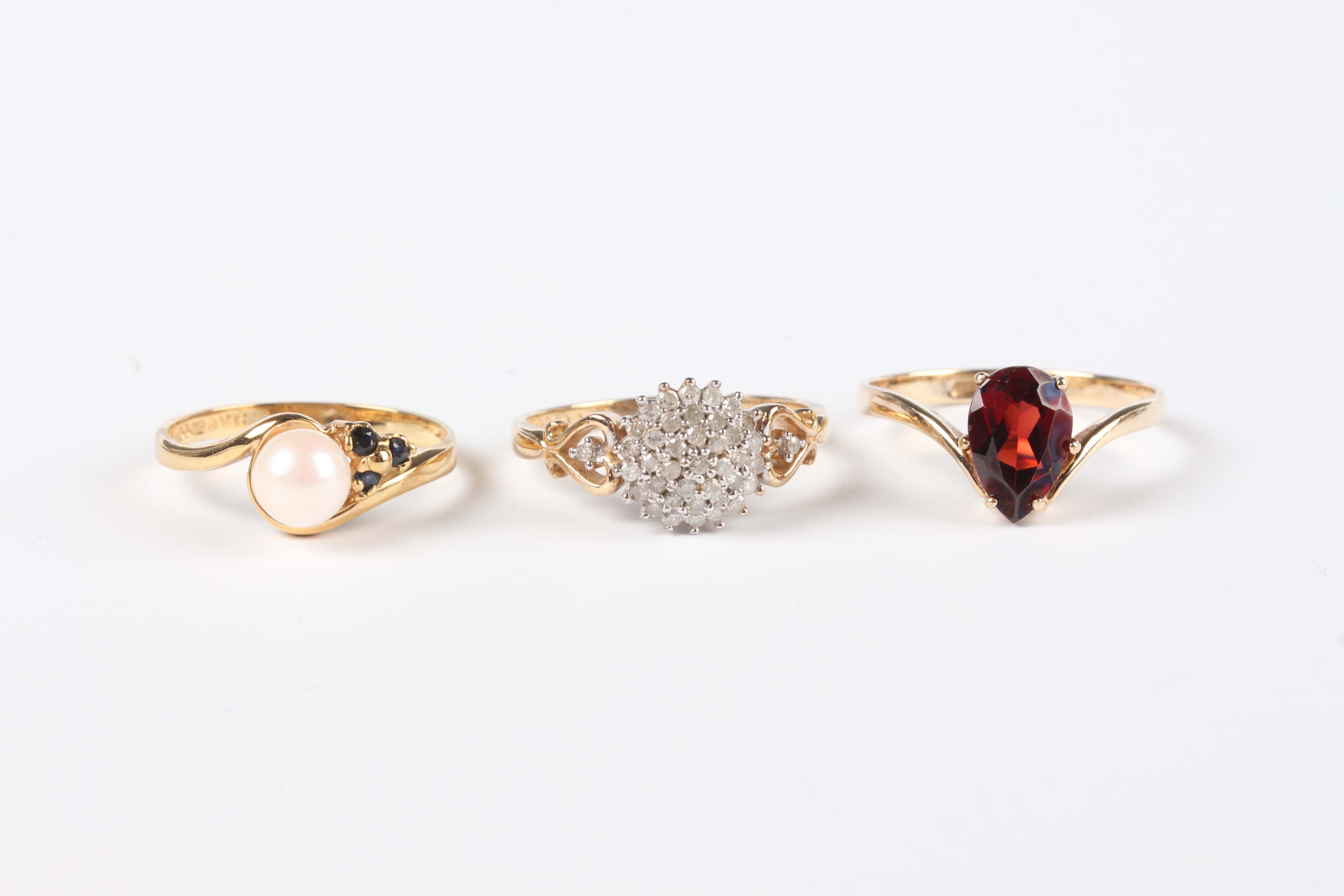 A 9ct gold ring, claw set with a pear shaped garnet, ring size approx M, another 9ct gold ring, mounted with a single cultured pearl and three circular cut sapphires, ring size approx K, and a 9ct gold and diamond cluster ring, detailed ‘0.25’, total weight 5g.