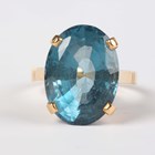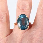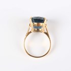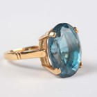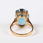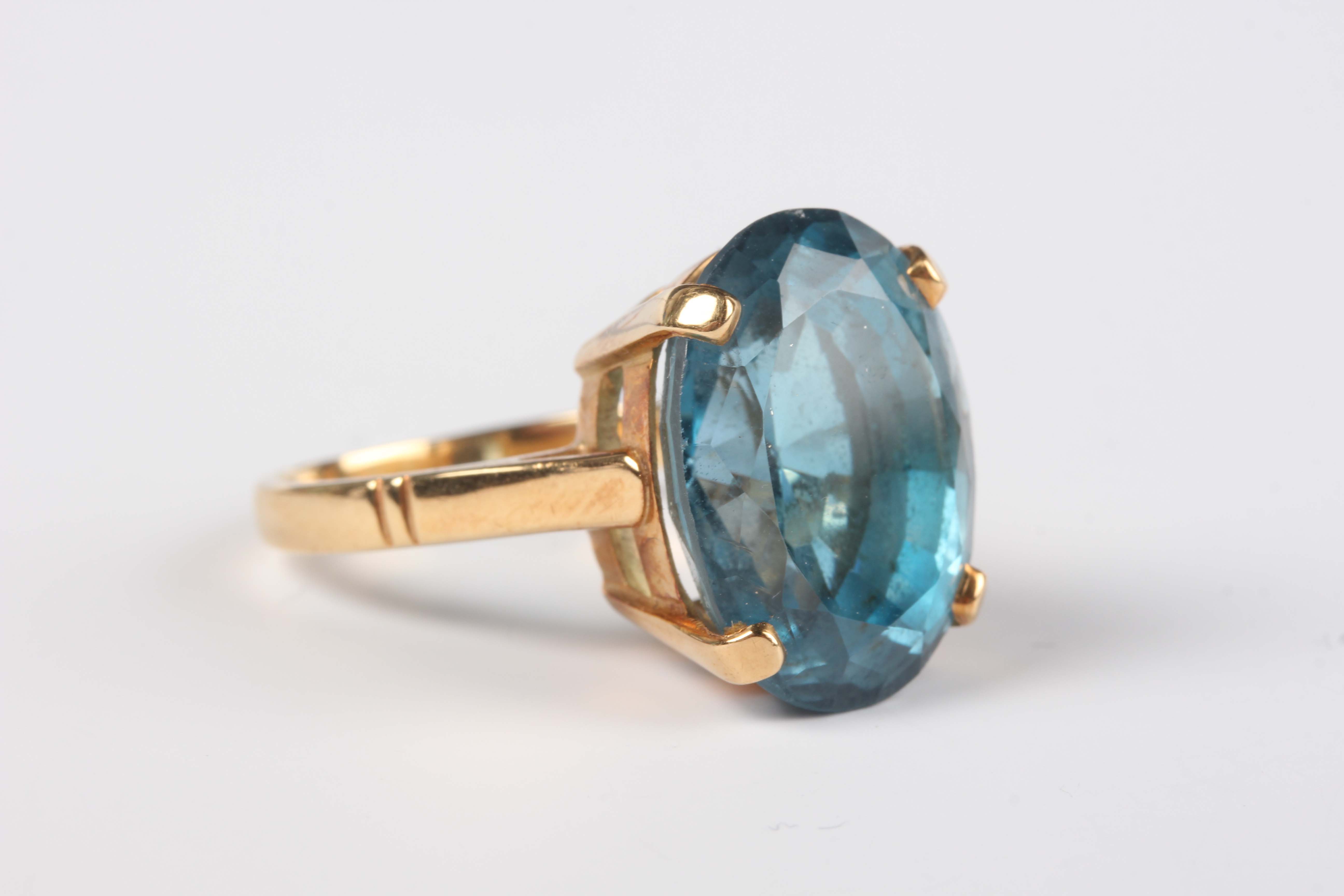 A gold ring, claw set with an oval cut blue topaz, detailed ‘750’, weight 10g, ring size approx Q, with a case.