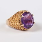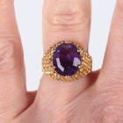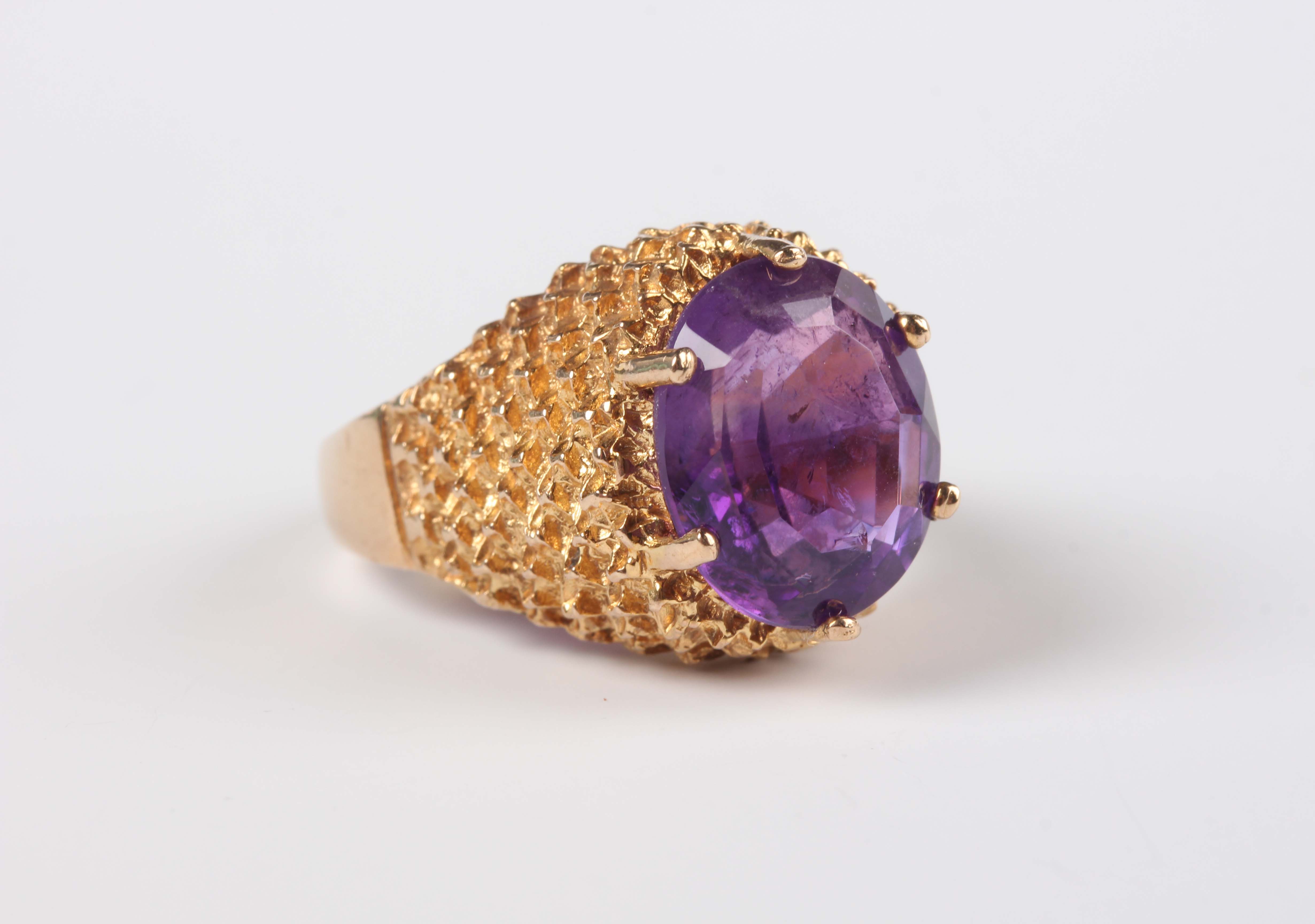 A 9ct gold ring, claw set with an oval cut amethyst, otherwise in a textured design, London 1970, weight 5.2g, ring size approx L1/2.