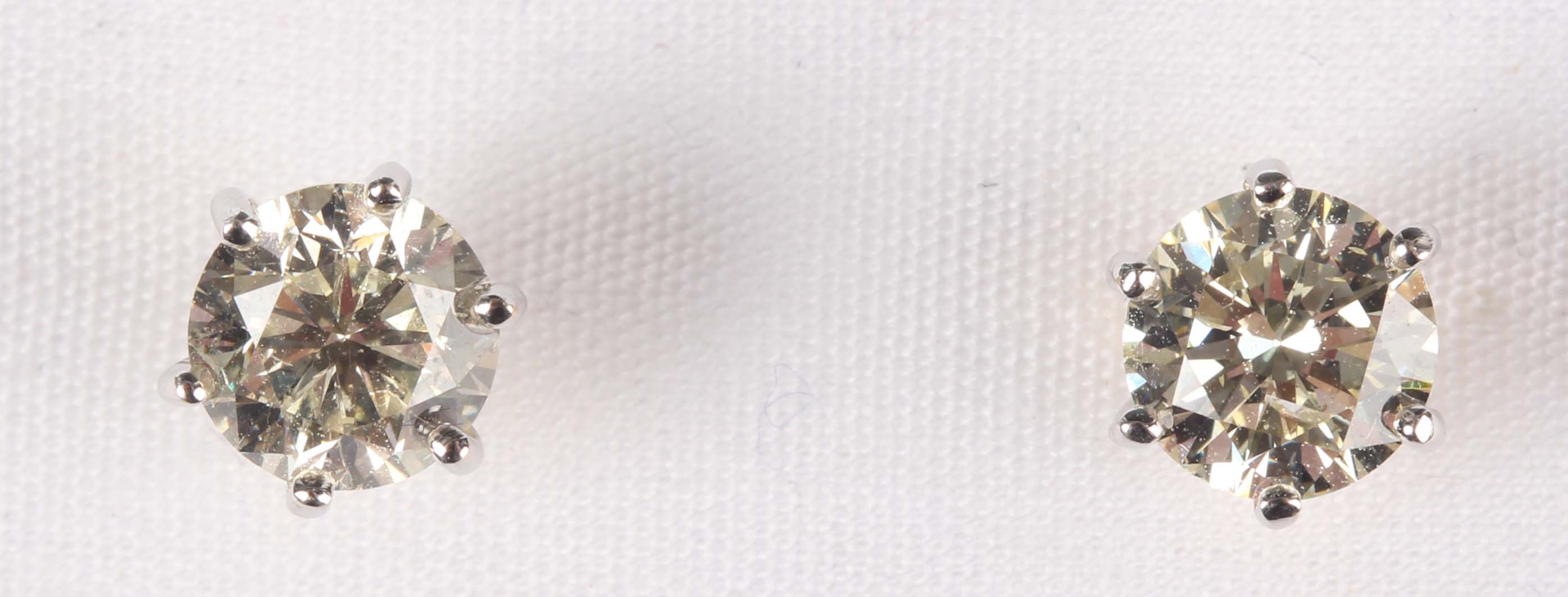 A pair of 18ct gold and diamond single stone earstuds, each claw set with a circular cut diamond, with post and butterfly fittings, total weight 2.9g, total diamond weight approx 1.48ct, with a case.