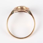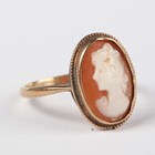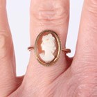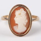 A gold mounted oval shell cameo ring, carved as a portrait of a lady, detailed ‘9ct’, weight 2.2g, ring size approx P, with a case.