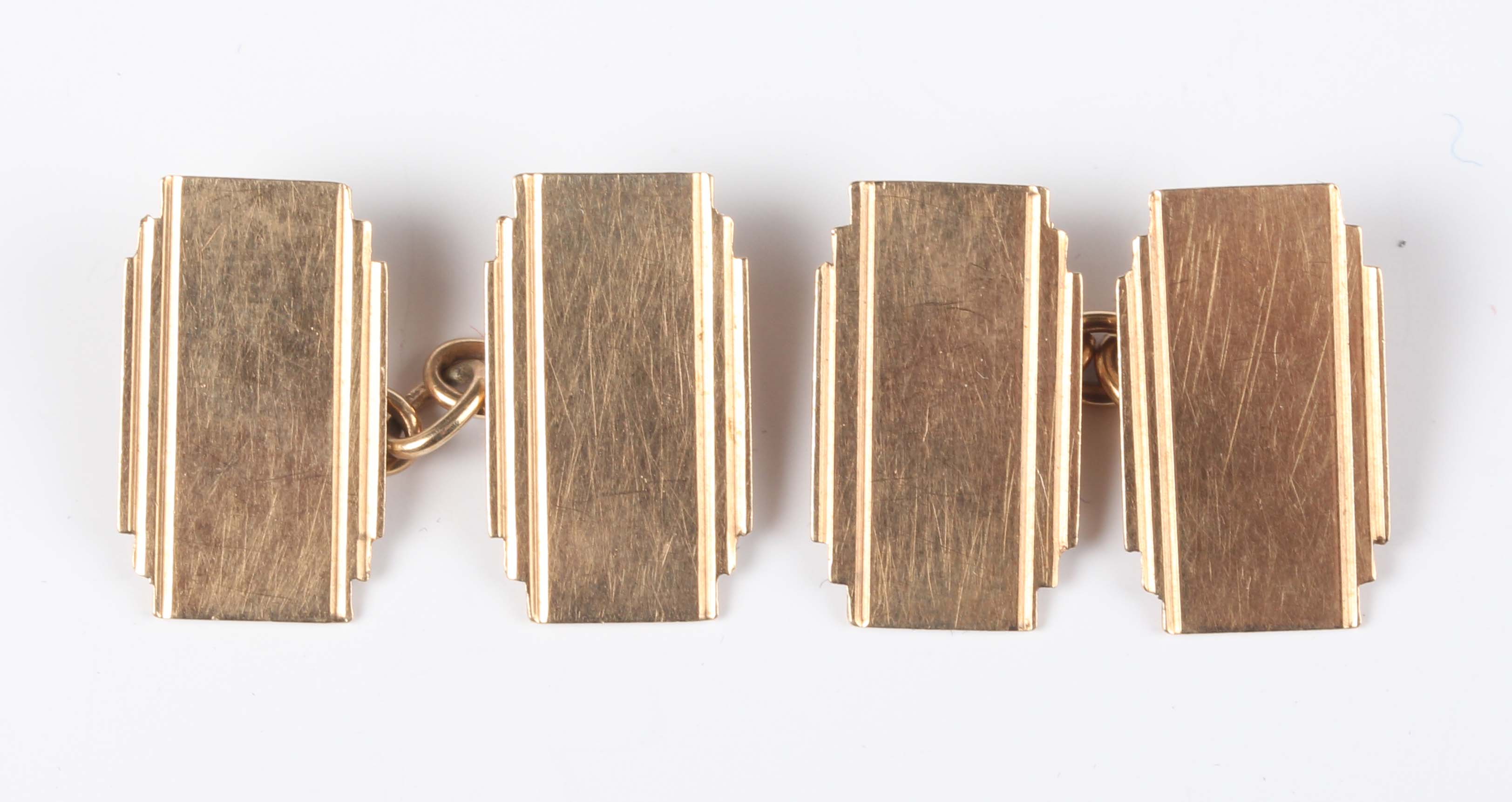 A pair of 9ct gold rectangular cufflinks in an Art Deco geometric design, Birmingham 1944, weight 4.6g, dimensions of each front 1.7cm x 1cm.