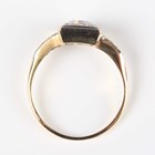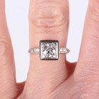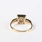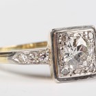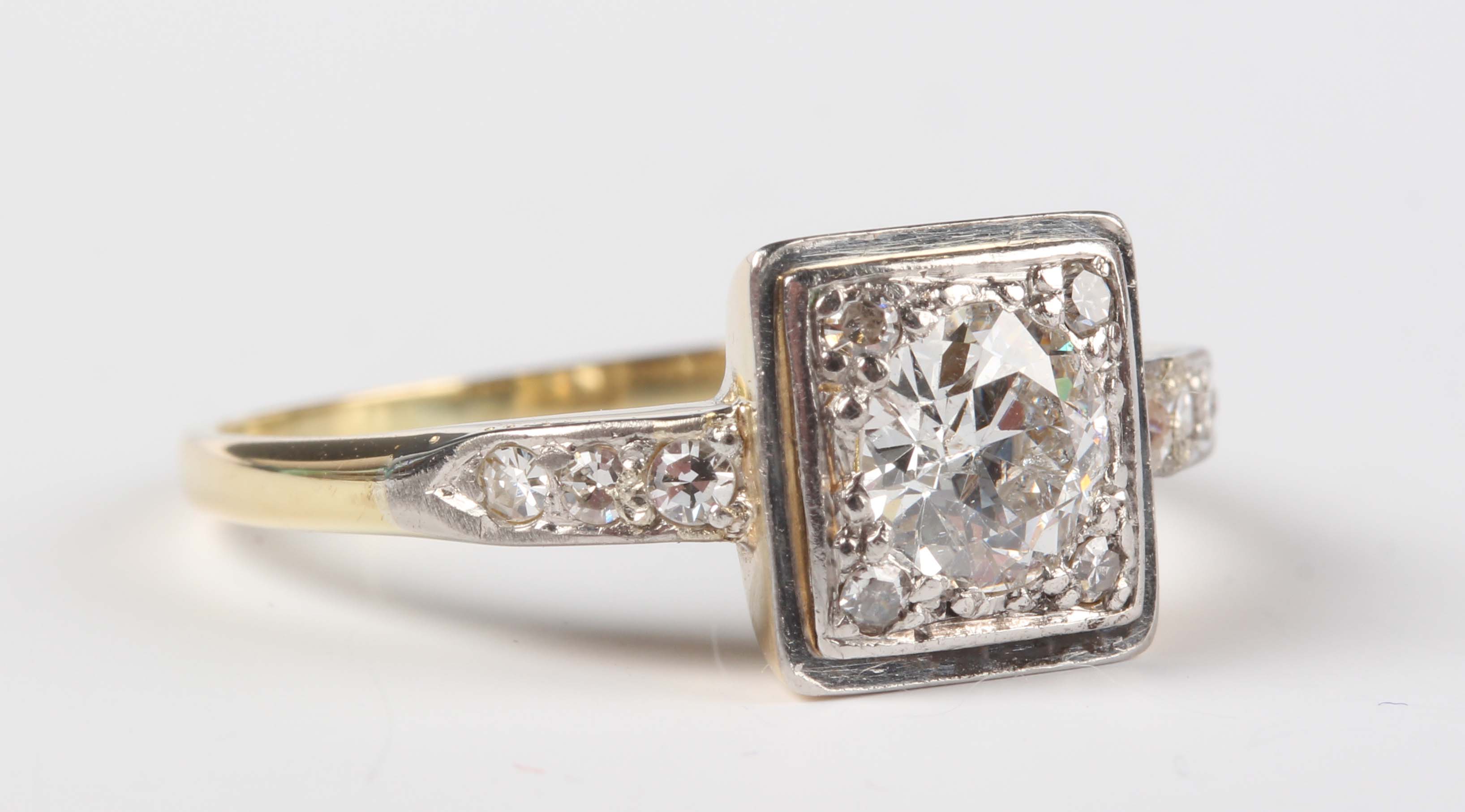 A gold, platinum and diamond ring, mounted with the principal circular cut diamond within a surround of four single cut diamonds in a square shaped setting, otherwise with single cut diamond three stone shoulders, detailed ‘18ct & Pt’, weight 3.3g, principal diamond weight approx 0.60-0.70ct, ring size approx O, with a case.